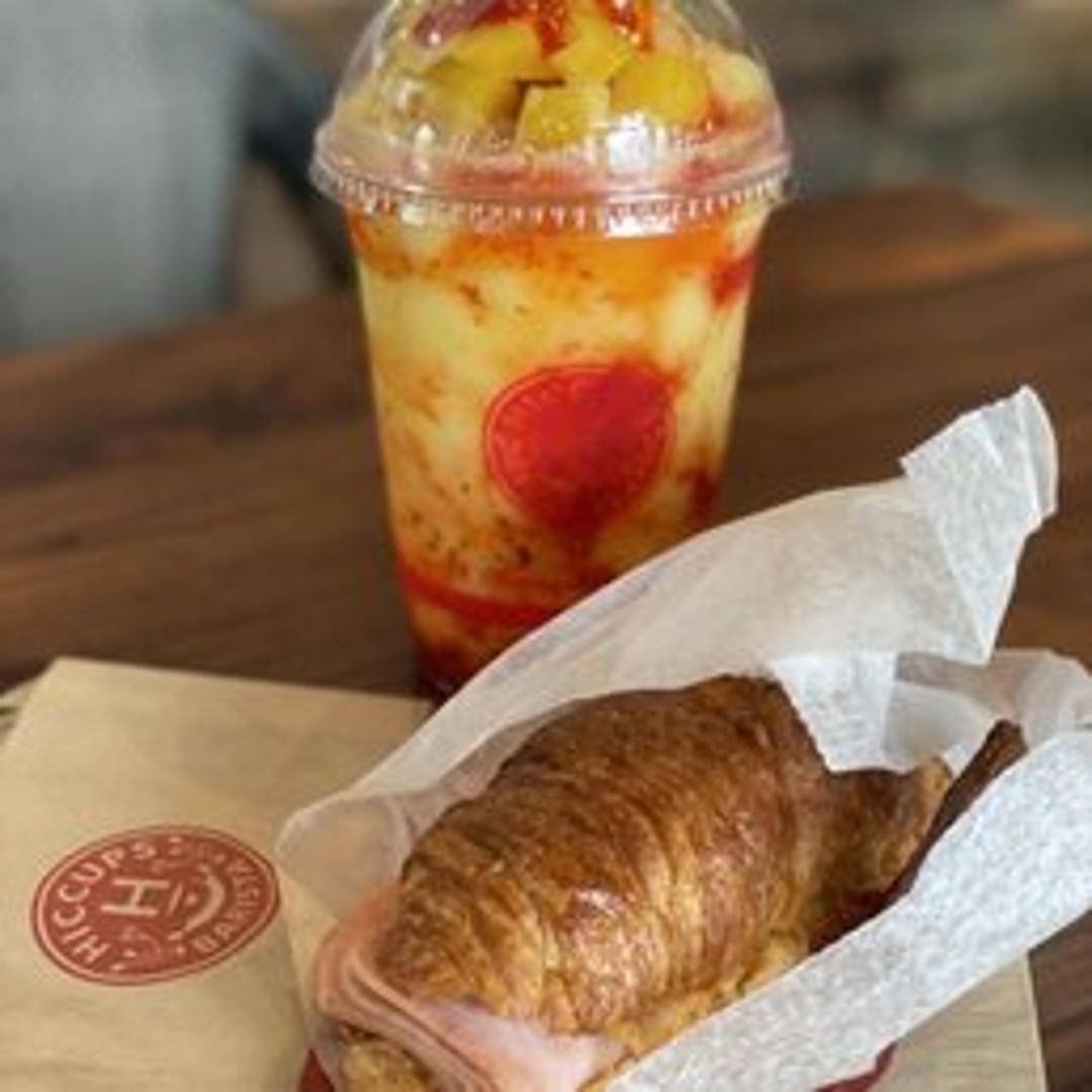 Flaky croissant filled with sliced ham and melted Swiss cheese.