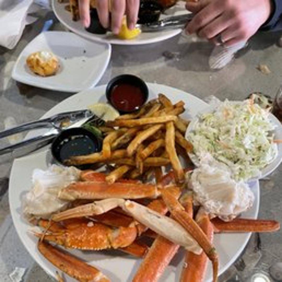 A generous portion of steamed crab legs, served with your choice of two sides. Options may include coleslaw, french fries, mashed potatoes, green beans, or other seasonal vegetables. Drawn butter included for dipping.