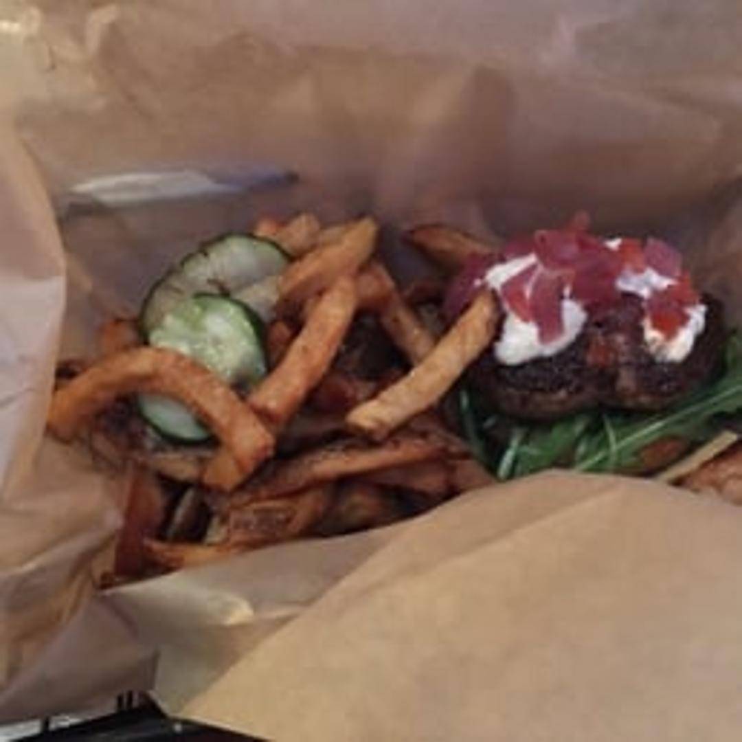 Ground lamb burger seasoned with Mediterranean spices, topped with feta cheese, cucumber, tomato, onion, and tzatziki sauce on a toasted bun.