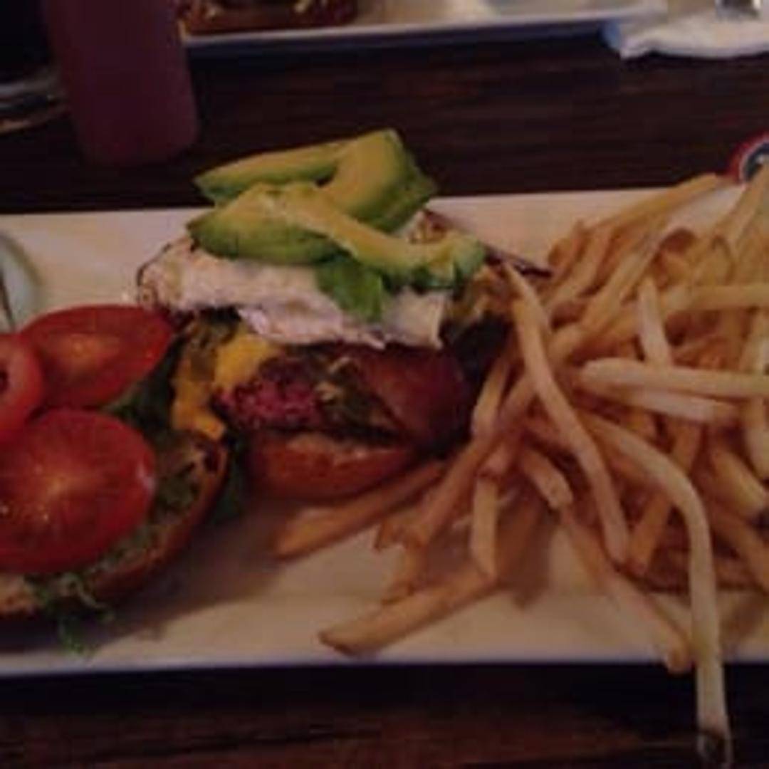 A classic pub-style burger featuring a perfectly cooked patty, melted cheddar cheese, crispy bacon, caramelized onions, and a special tavern sauce on a toasted brioche bun.