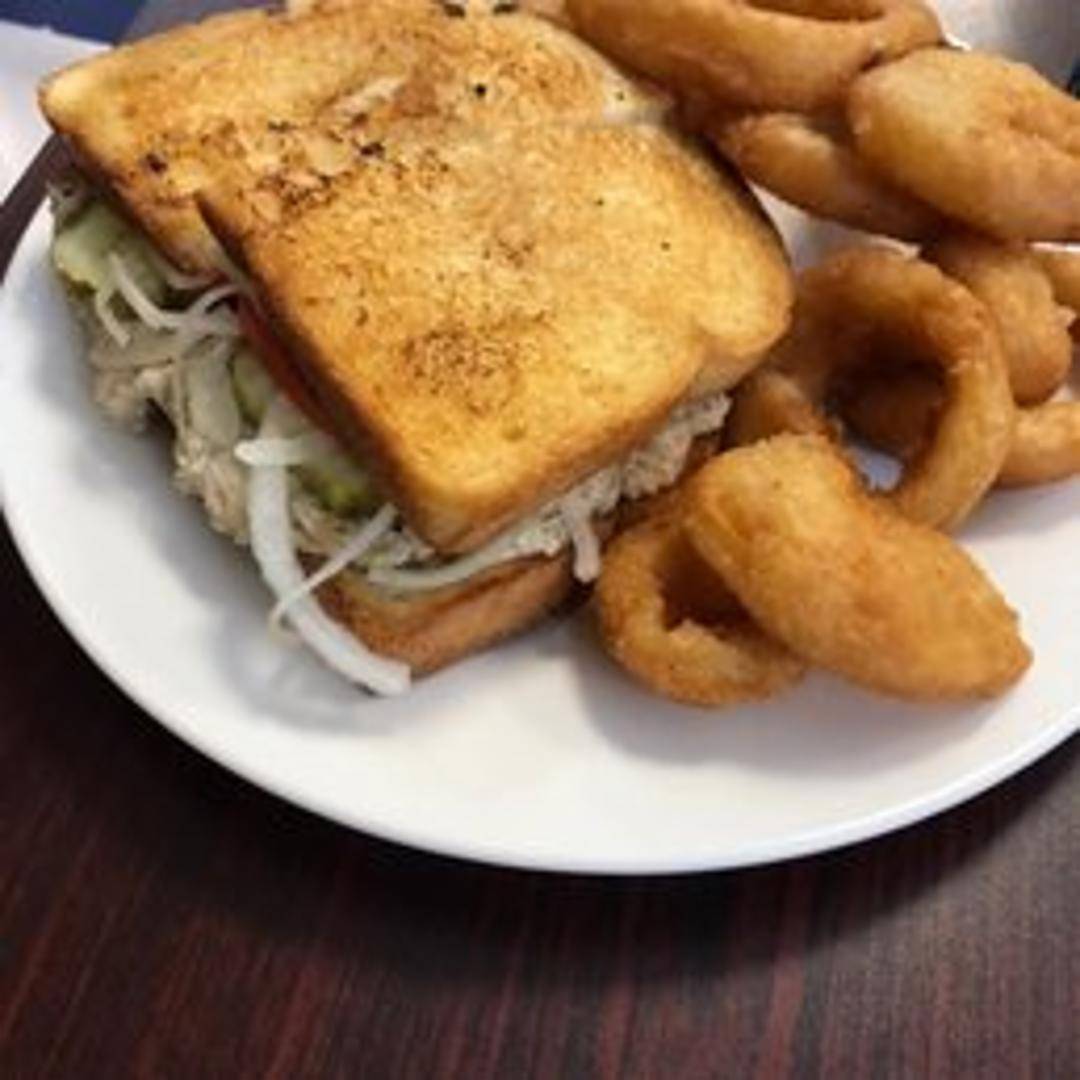 A grilled sandwich filled with a creamy tuna salad and melted cheese, served on toasted bread.