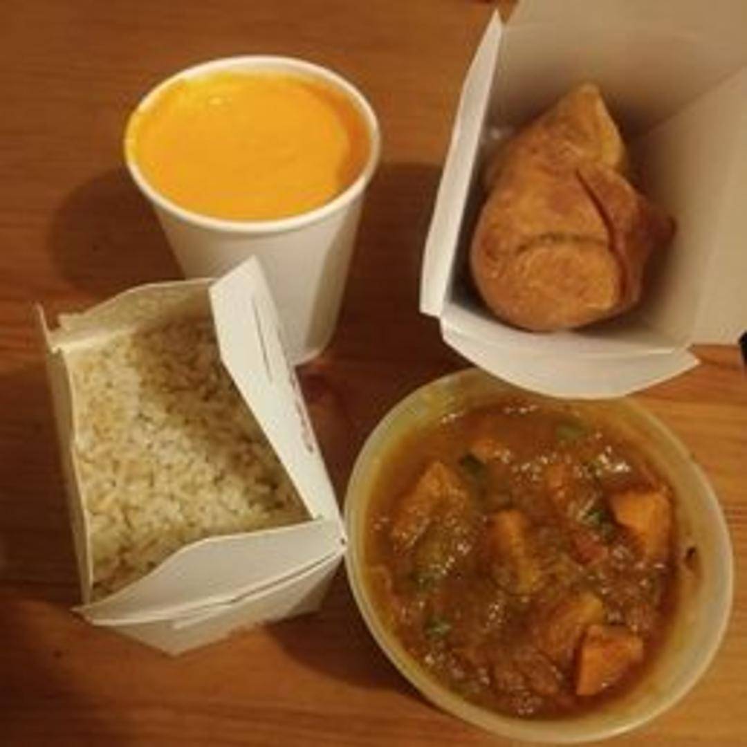 A creamy and mildly sweet curry featuring pumpkin cooked with coconut milk, fragrant spices, and herbs. A vegetarian delight, served with rice.