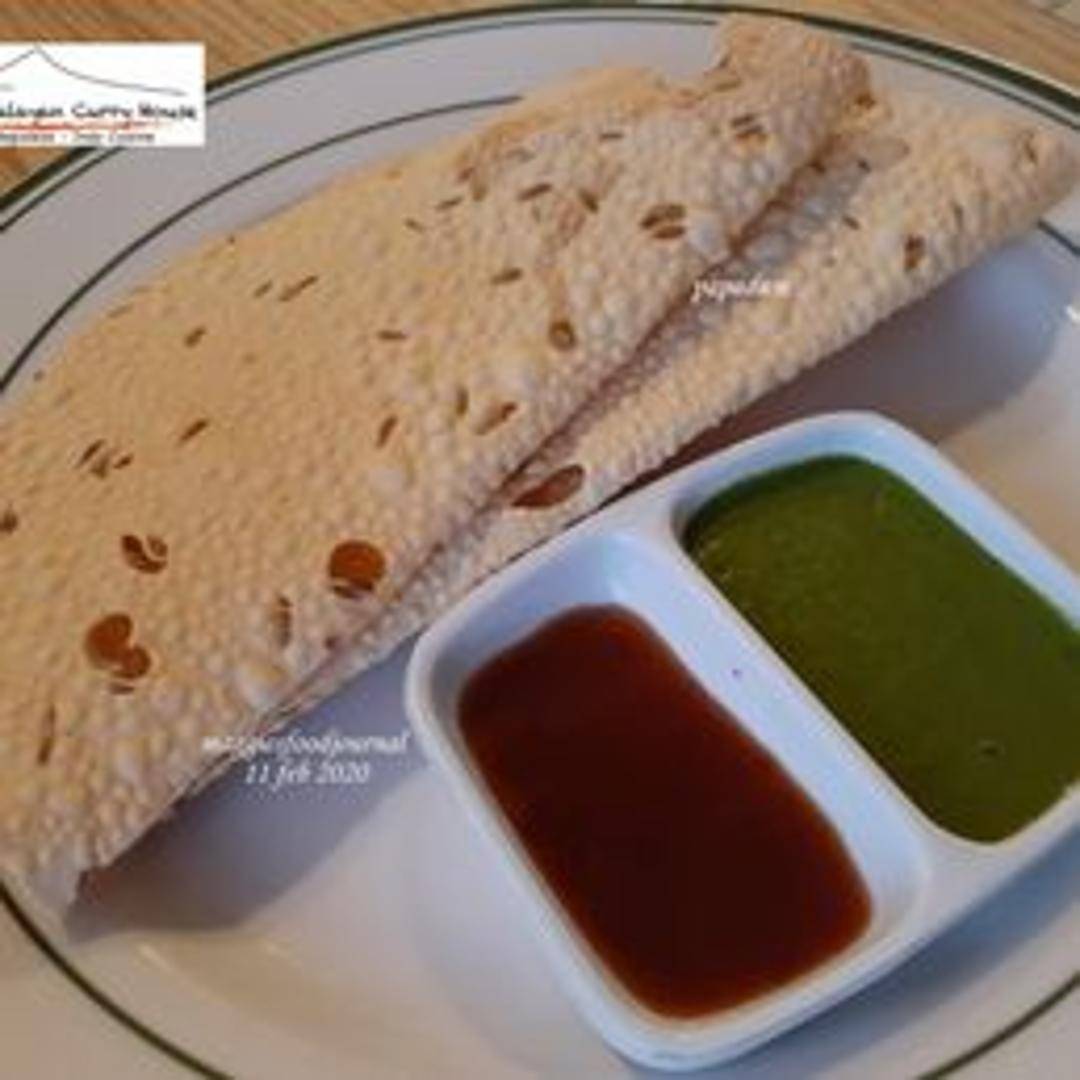 Thin, crispy lentil flour wafers, typically seasoned with black pepper and cumin. Served roasted or fried and enjoyed as an appetizer or accompaniment to a meal.