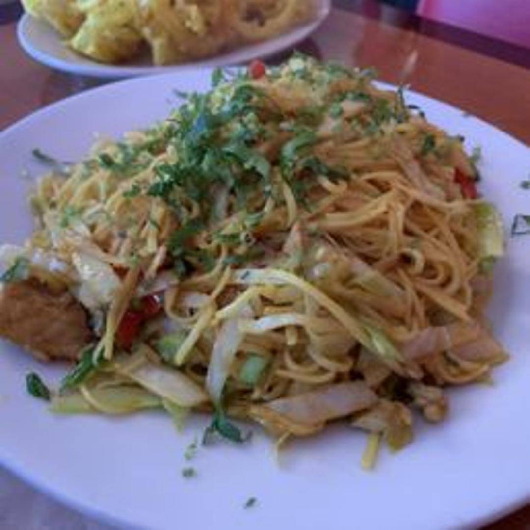 Stir-fried noodles with vegetables and your choice of protein (chicken, vegetable, goat, lamb, shrimp, or tofu). The dish features a savory sauce, incorporating soy sauce and spices. It is typically garnished with green onions.