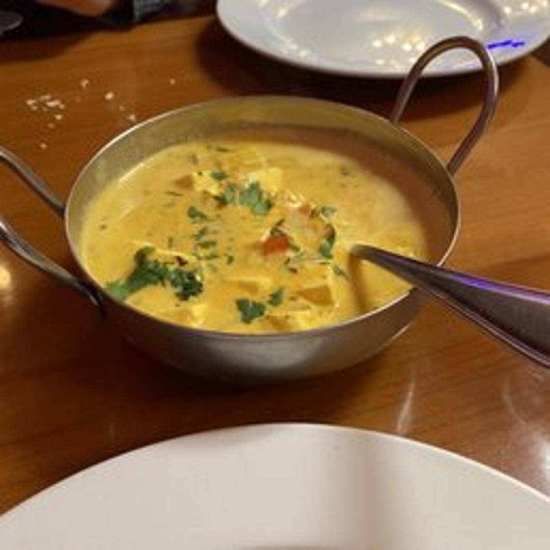A rich and creamy North Indian curry featuring succulent paneer (Indian cheese) simmered in a flavorful korma sauce. The sauce is made with a blend of cashew nuts, cream, yogurt, and aromatic spices, resulting in a mildly sweet and delicately spiced vegetarian dish. Garnished with fresh cilantro.