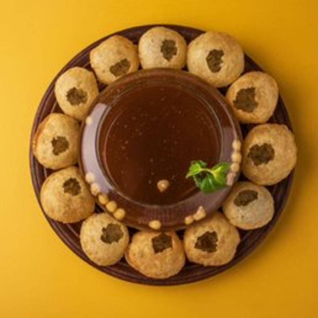 An iconic Indian street food snack consisting of hollow, crispy semolina or wheat shells (puri) filled with a delightful mixture of spiced mashed potatoes or chickpeas, and then filled with a refreshing, tangy, and spicy flavored water (pani).
