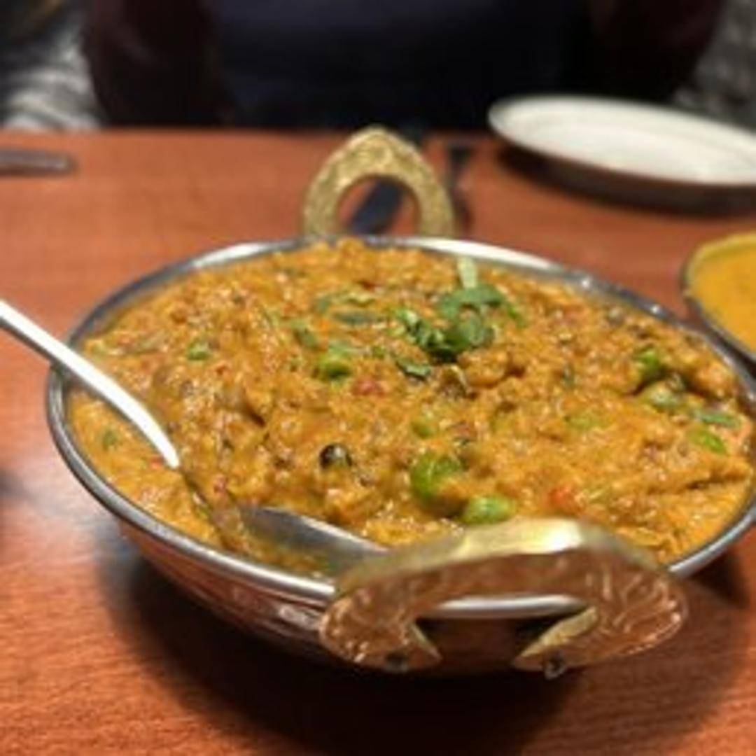 Smoked eggplant mashed and cooked with tomatoes, onions, garlic, ginger, and aromatic spices. A smoky and savory vegetarian dish, often served as a flavorful side or main course.