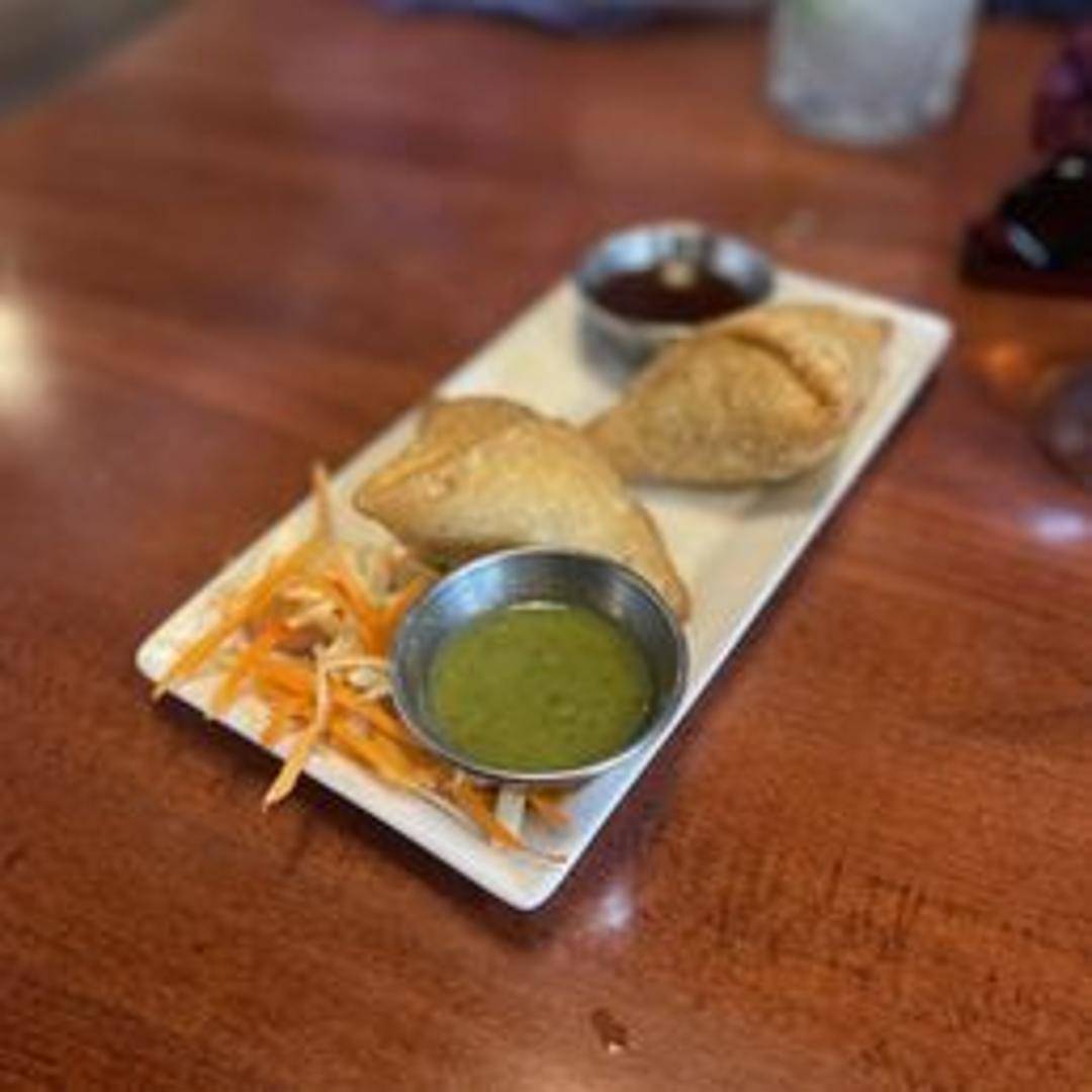 Crispy, deep-fried pastry filled with spiced potatoes, peas, and other vegetables. Served with chutney.