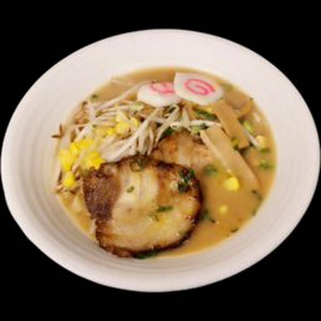 A comforting bowl of traditional Japanese ramen featuring a rich and savory miso-based broth, tender chashu pork, perfectly cooked ramen noodles, a soft-boiled egg, crisp bamboo shoots, scallions, and a sheet of nori seaweed, offering a harmonious blend of flavors and textures.
