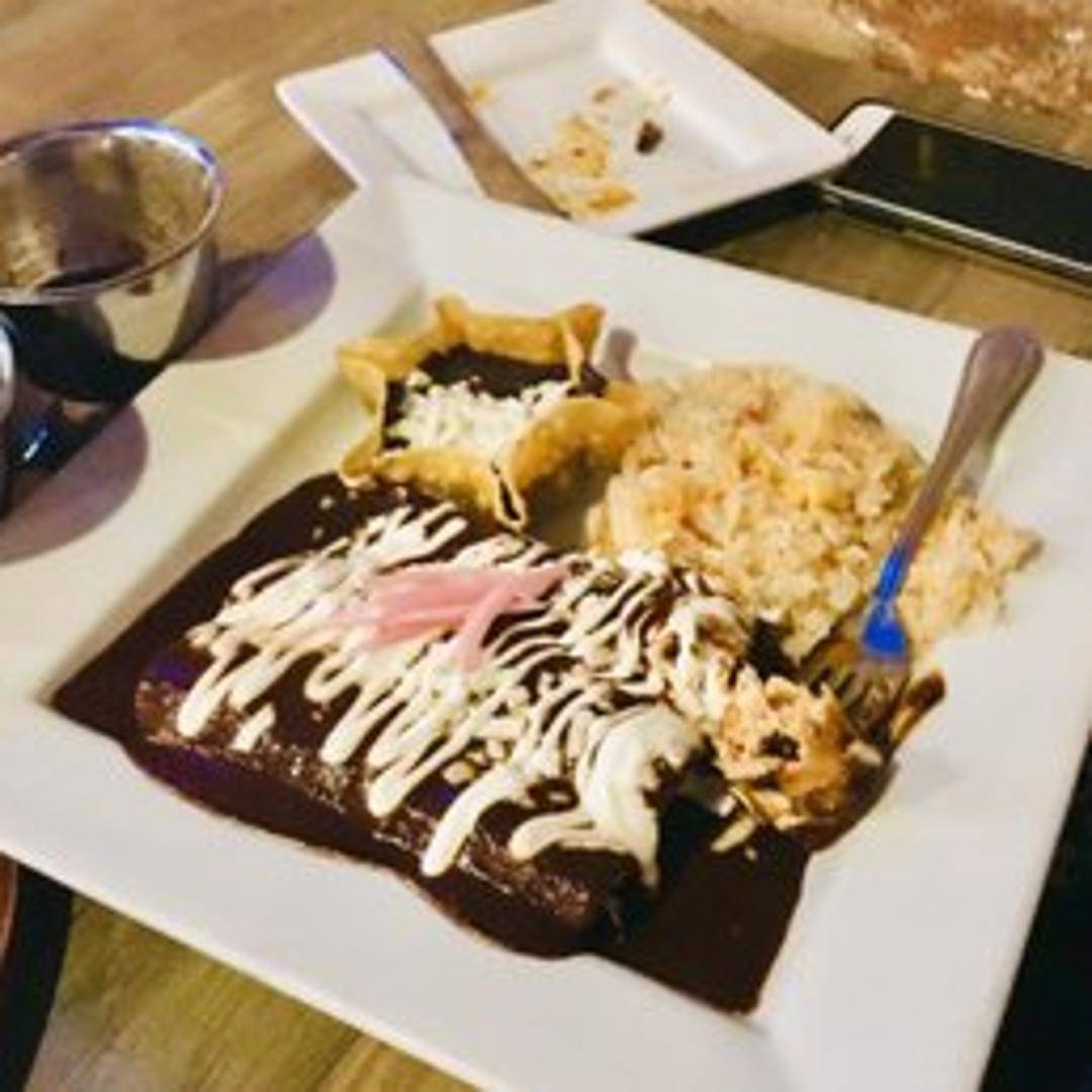 Corn tortillas filled with your choice of chicken, cheese, or vegetables, smothered in a rich and complex mole sauce. Garnished with queso fresco, onions, and cilantro. Served with rice and beans.