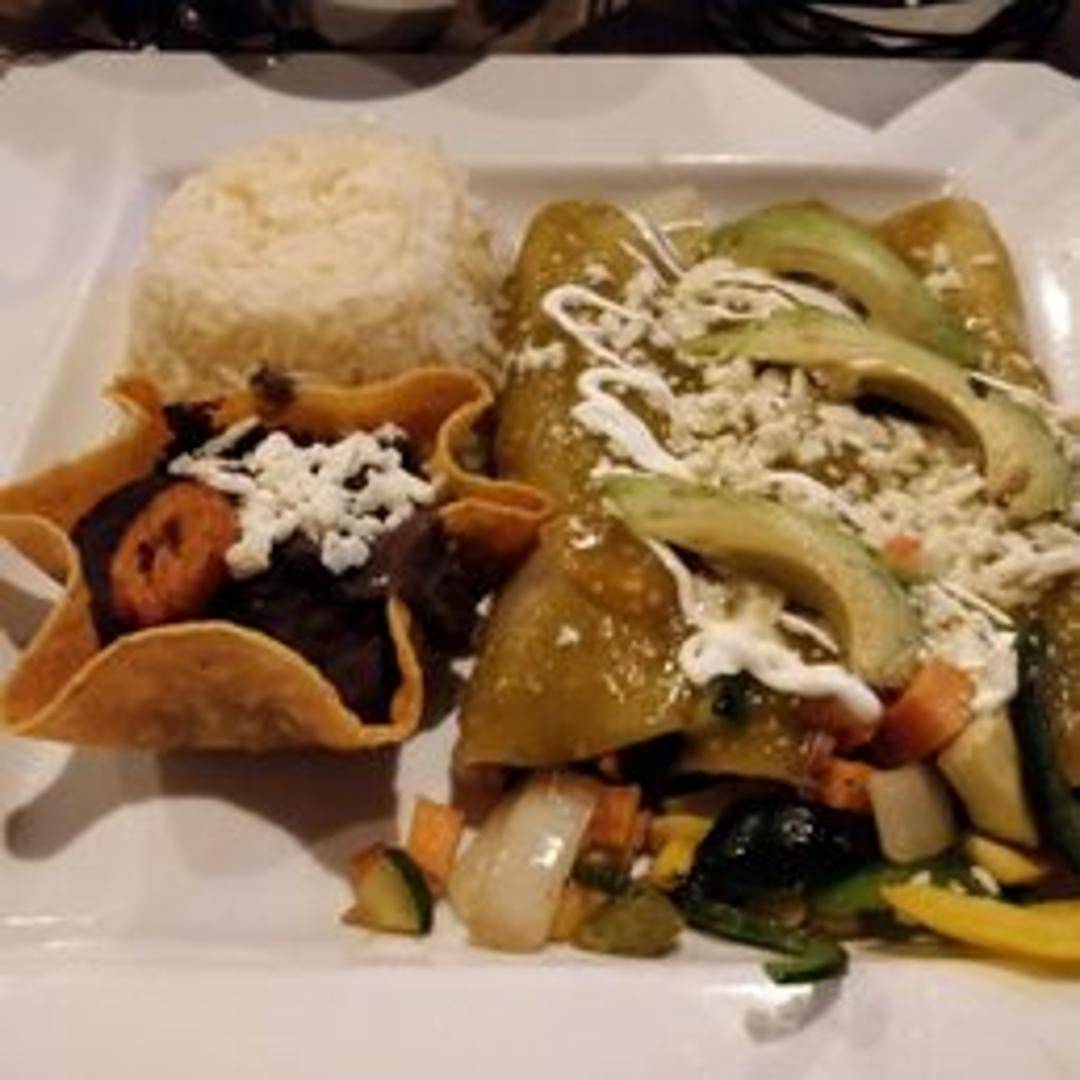 Corn tortillas filled with a medley of seasonal vegetables, such as zucchini, corn, bell peppers, and mushrooms. Topped with a mild green sauce and melted cheese. Garnished with sour cream. Served with rice and beans.