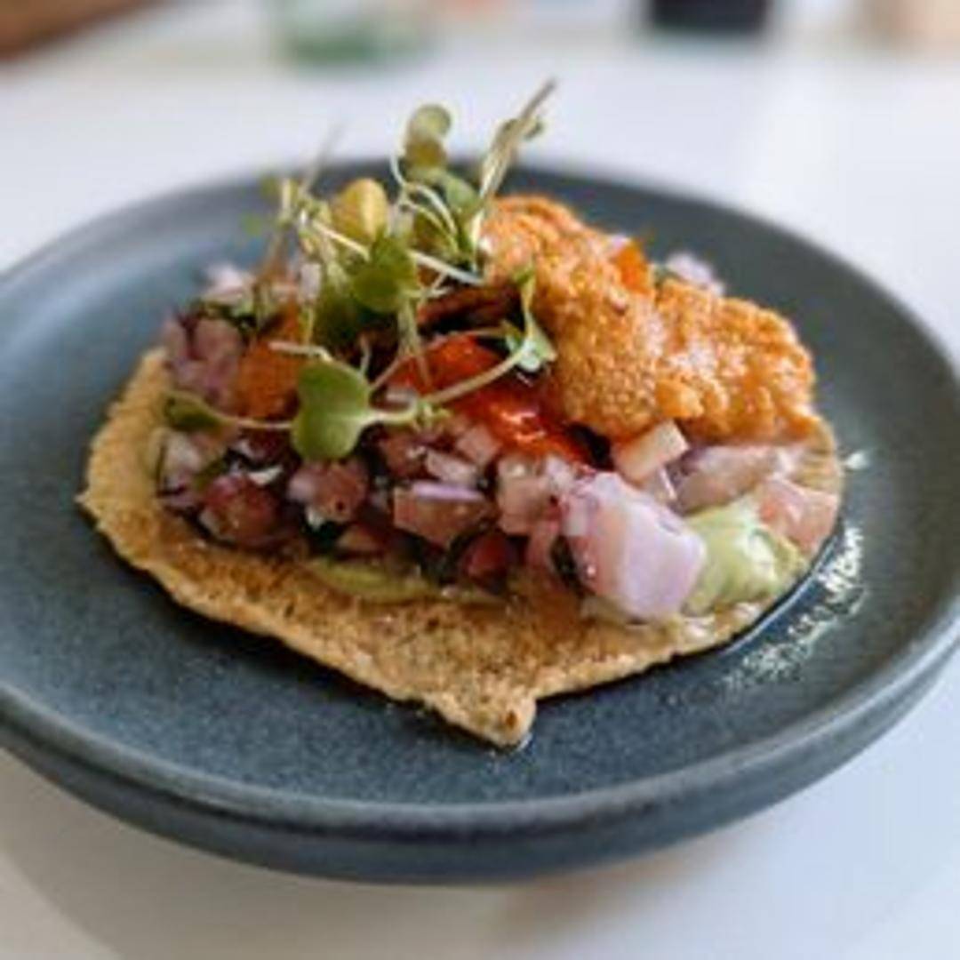 Crispy tostada topped with slices of fresh kanpachi (amberjack) and creamy uni (sea urchin). Often includes other components such as avocado, sesame seeds, or a delicate citrus vinaigrette to complement the rich flavors and textures.
