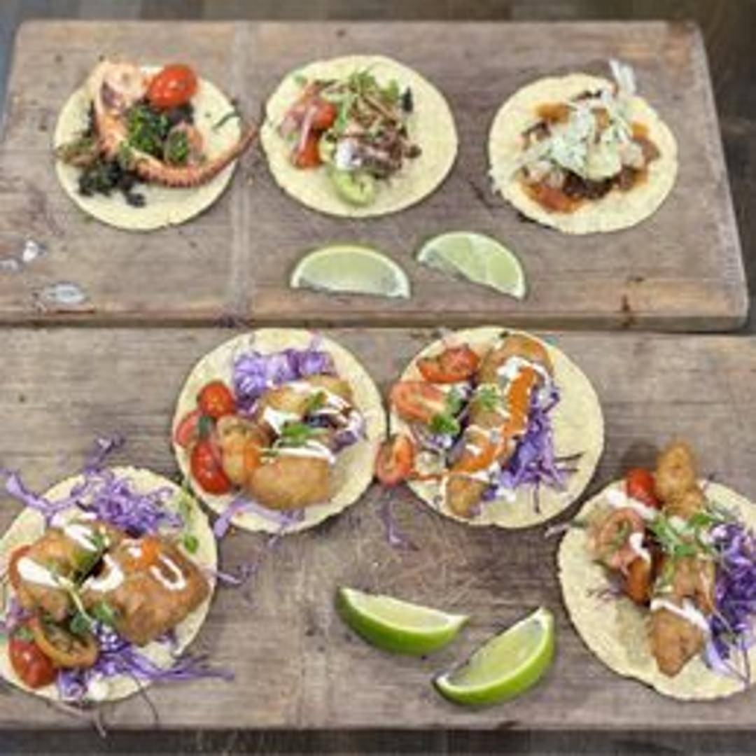A taco filled with grilled or pan-seared scallops, topped with fresh toppings and sauce, served on a corn or flour tortilla.