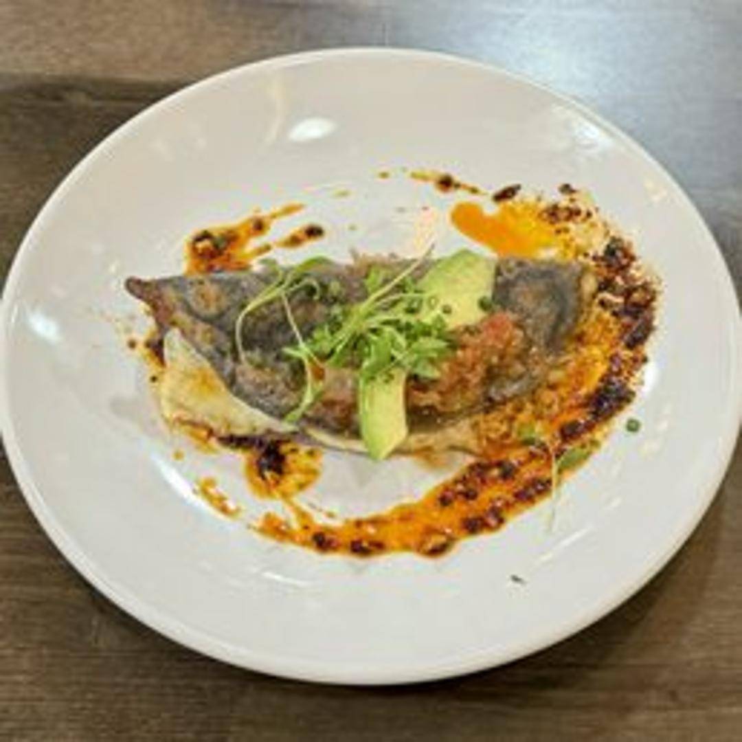 A taco featuring wood-grilled Kanpachi (amberjack) fish, topped with complimentary toppings that enhance the flavor of the fish, served on a corn or flour tortilla.