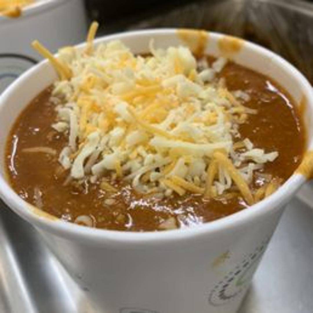 Hearty chili made with a blend of ground beef, beans, tomatoes, and spices. Available with toppings such as shredded cheese, sour cream, and onions.