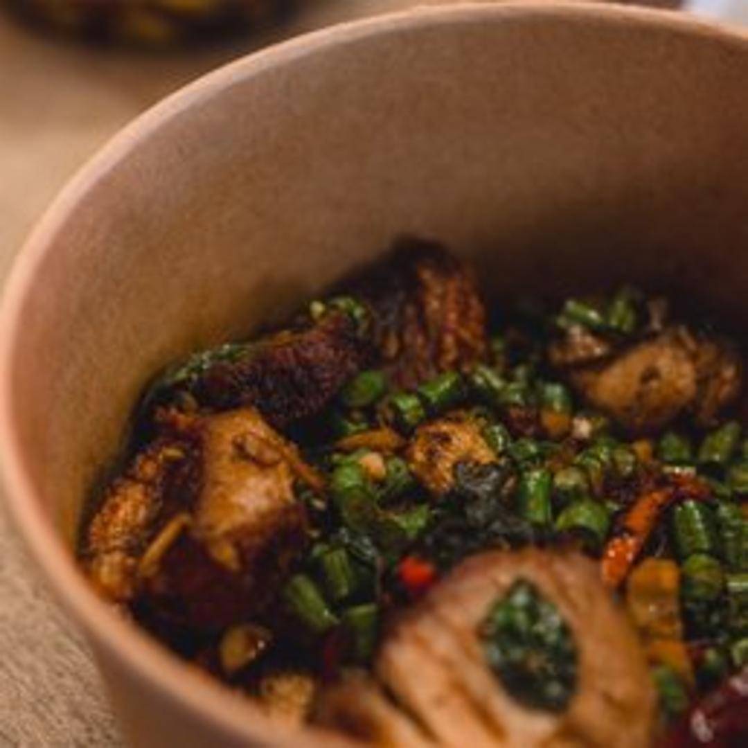 Stir-fried dish with your choice of protein, Thai basil, chili, garlic, and bell peppers served over rice. Topped with a fried egg.