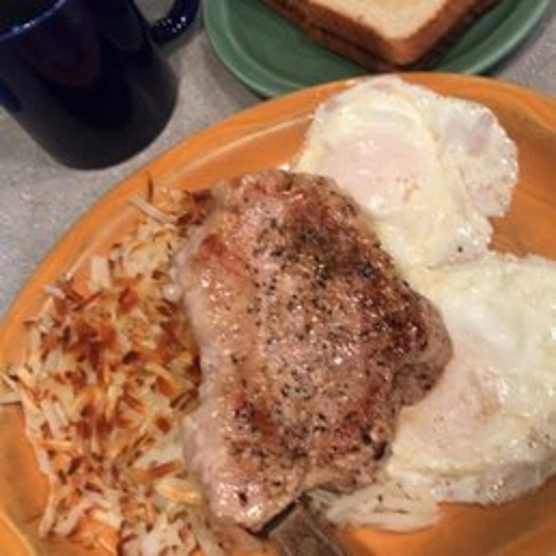 A juicy, boneless pork chop served with two eggs cooked to your liking. Includes your choice of side: hash browns, home fries, or grits, and toast or pancakes.
