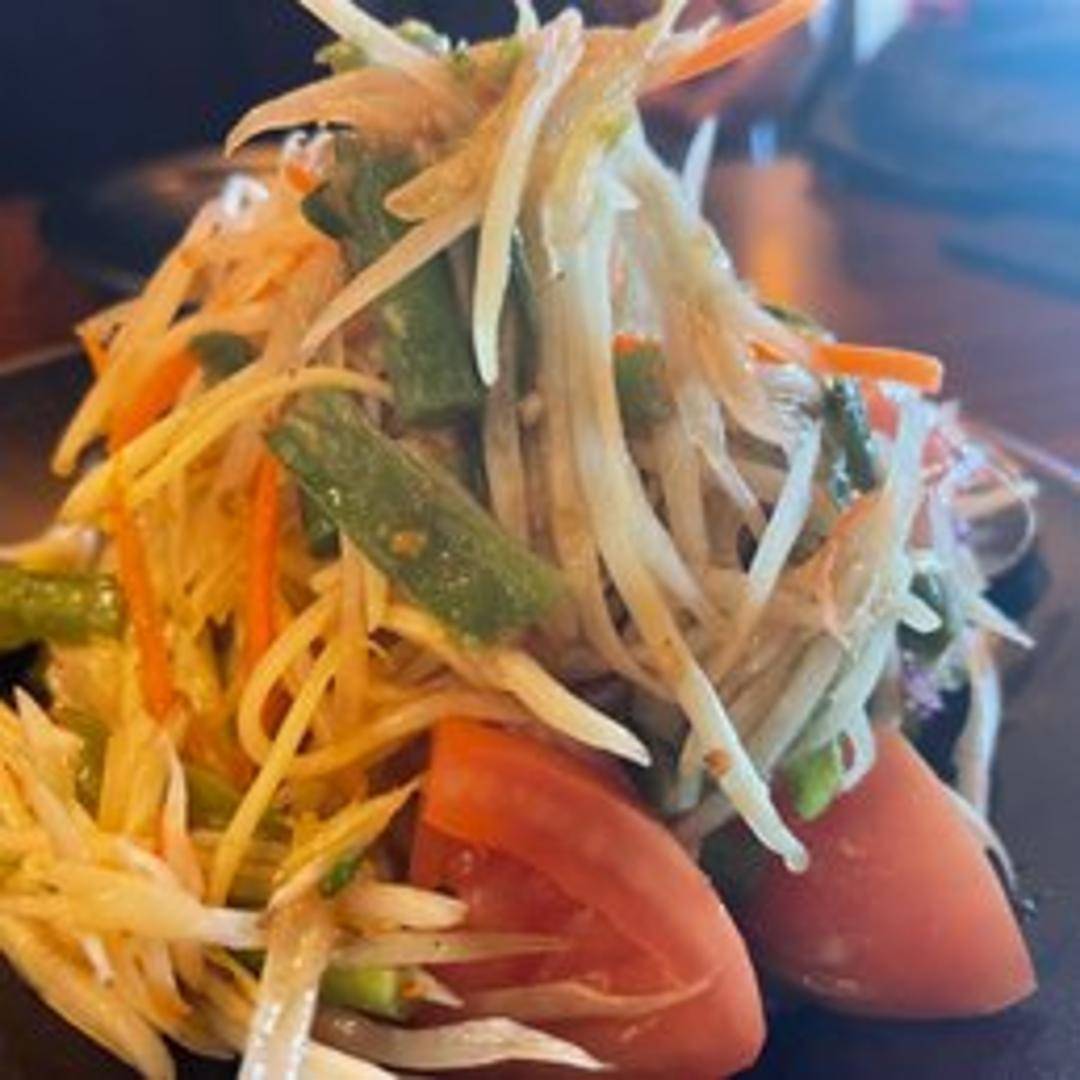 A refreshing and spicy Thai salad made with shredded green papaya, tomatoes, green beans, carrots, peanuts, dried shrimp, fish sauce, lime juice, palm sugar, and chili peppers. A balance of sweet, sour, salty, and spicy flavors.