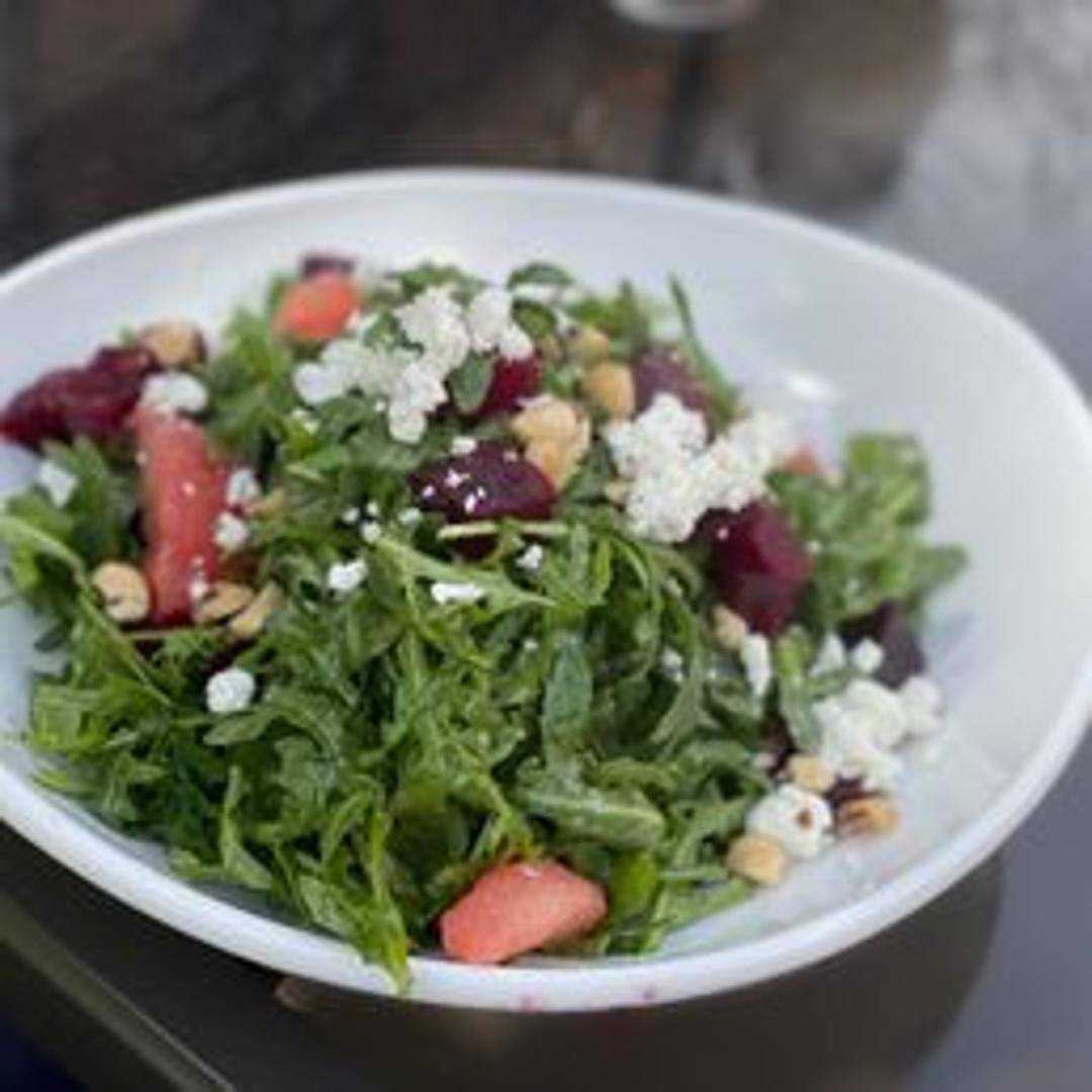 Roasted beets served on a bed of greens, with goat cheese crumbles, candied walnuts, and a balsamic vinaigrette.