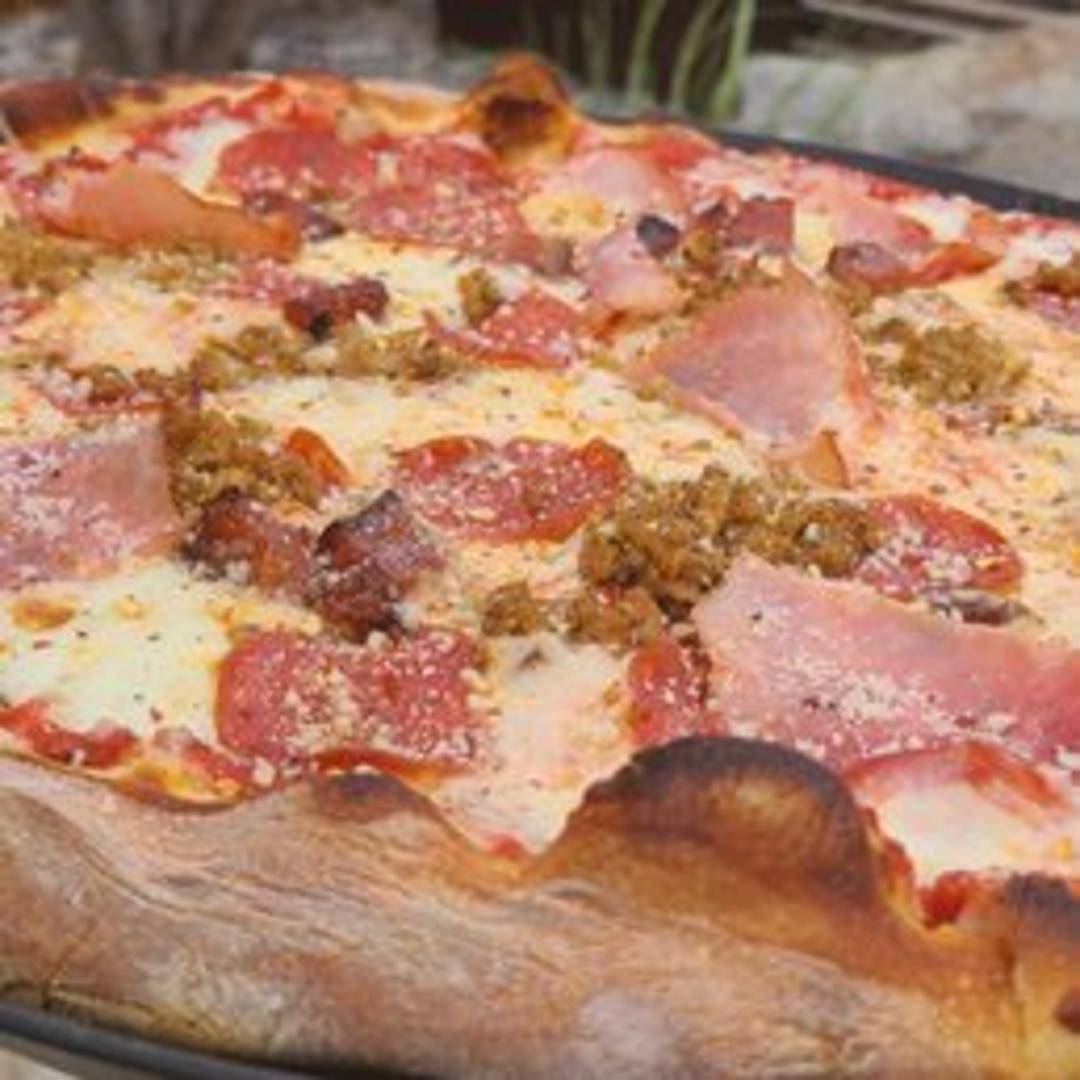 Pizza overloaded with various meat toppings such as pepperoni, sausage, bacon, and ham with mozzarella cheese and tomato sauce.