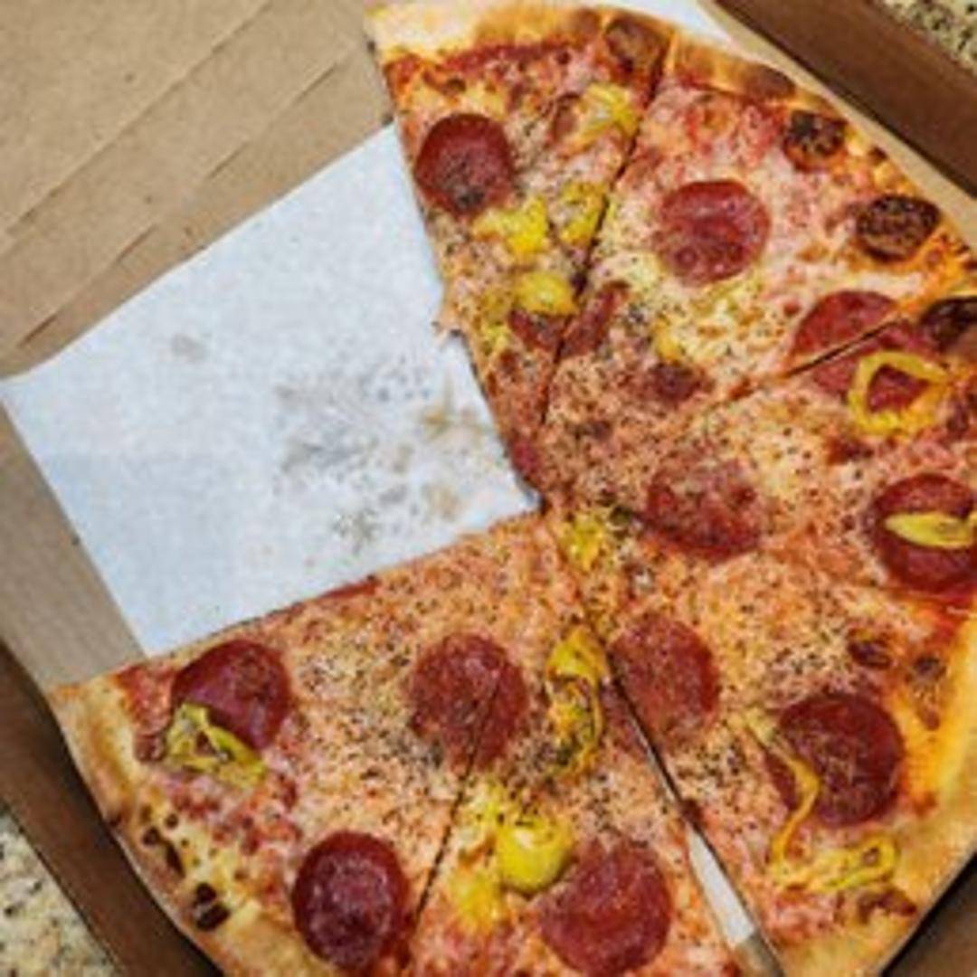 Pizza featuring sausage, pepperoni, bacon, mushrooms, and black olives.