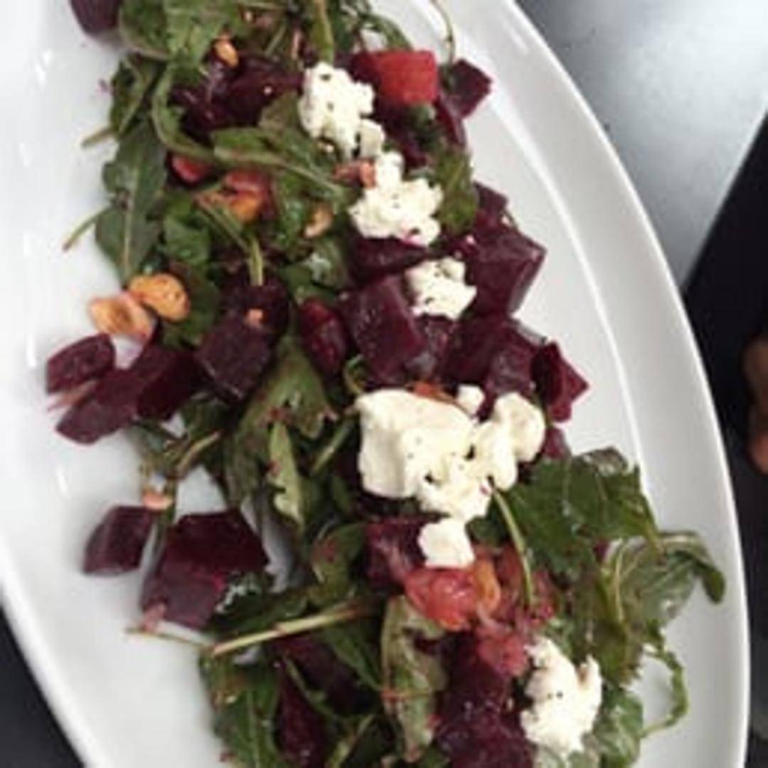 Salad featuring roasted beets, mixed greens, goat cheese, candied walnuts, and a vinaigrette dressing.