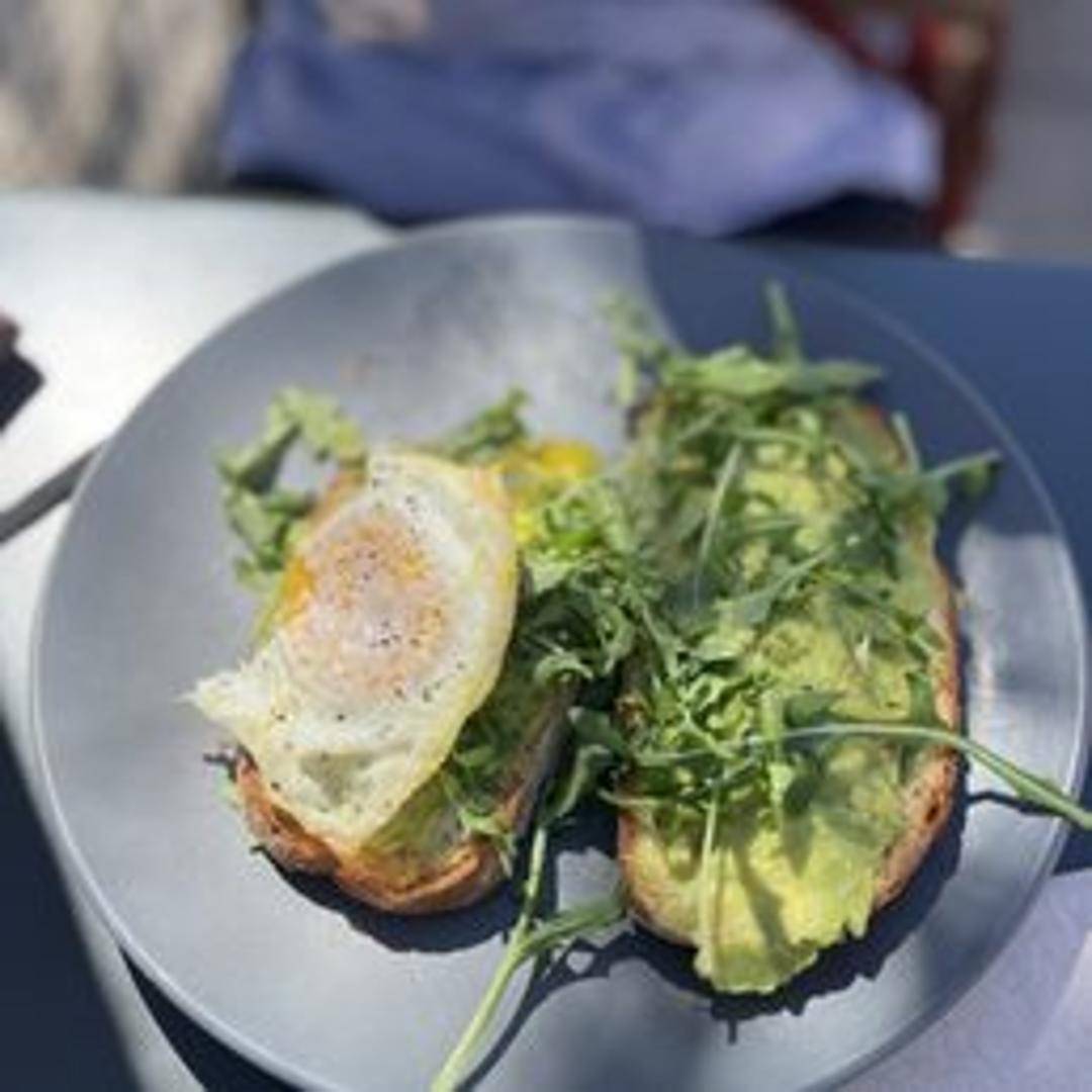 Toasted multigrain bread topped with fresh avocado, a sprinkle of red pepper flakes, and a drizzle of olive oil. Optional additions include a fried egg, everything bagel seasoning, or sliced tomatoes.