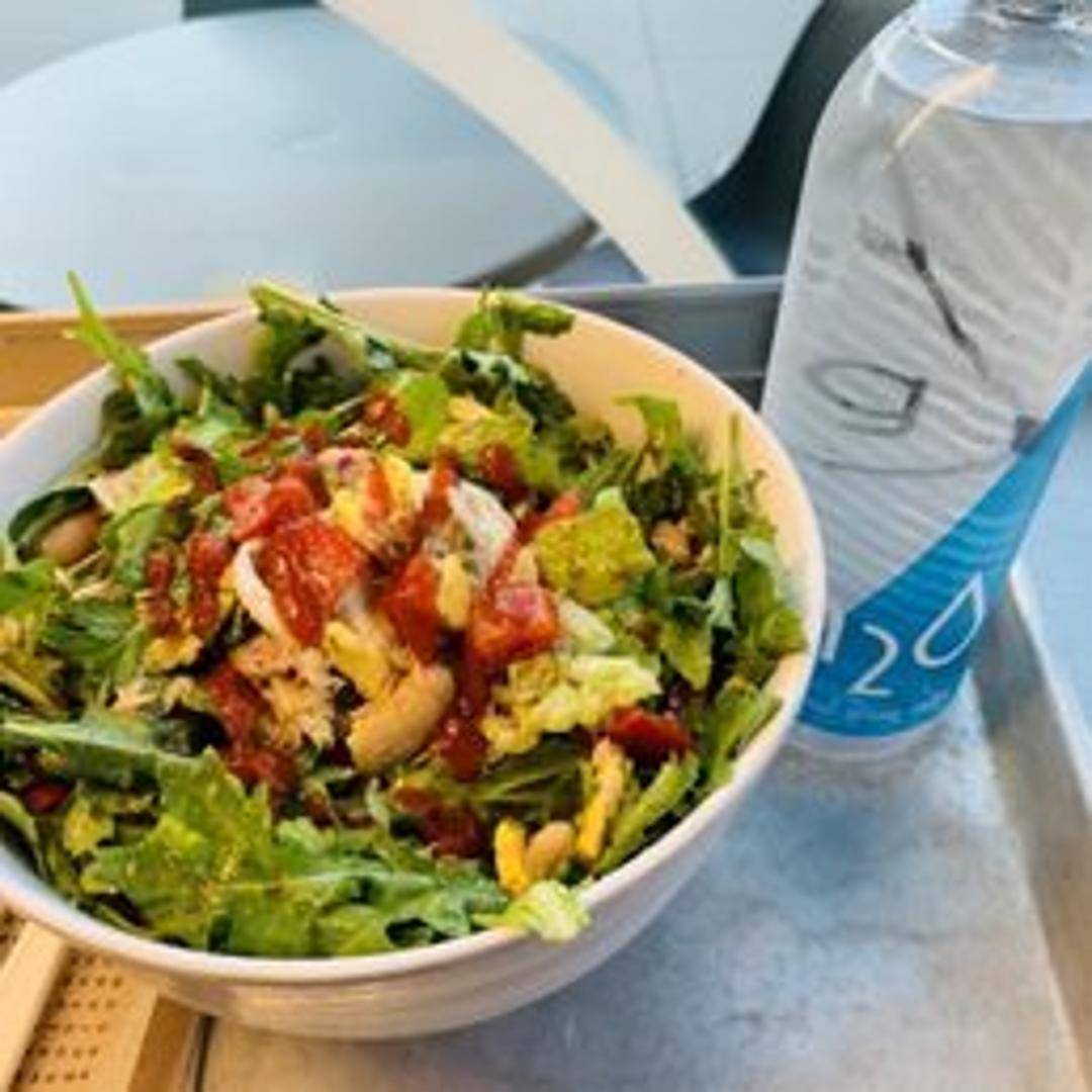 A refreshing and protein-packed salad featuring albacore tuna, cannellini beans, red onion, celery, roasted red peppers, lemon vinaigrette, and mixed greens.