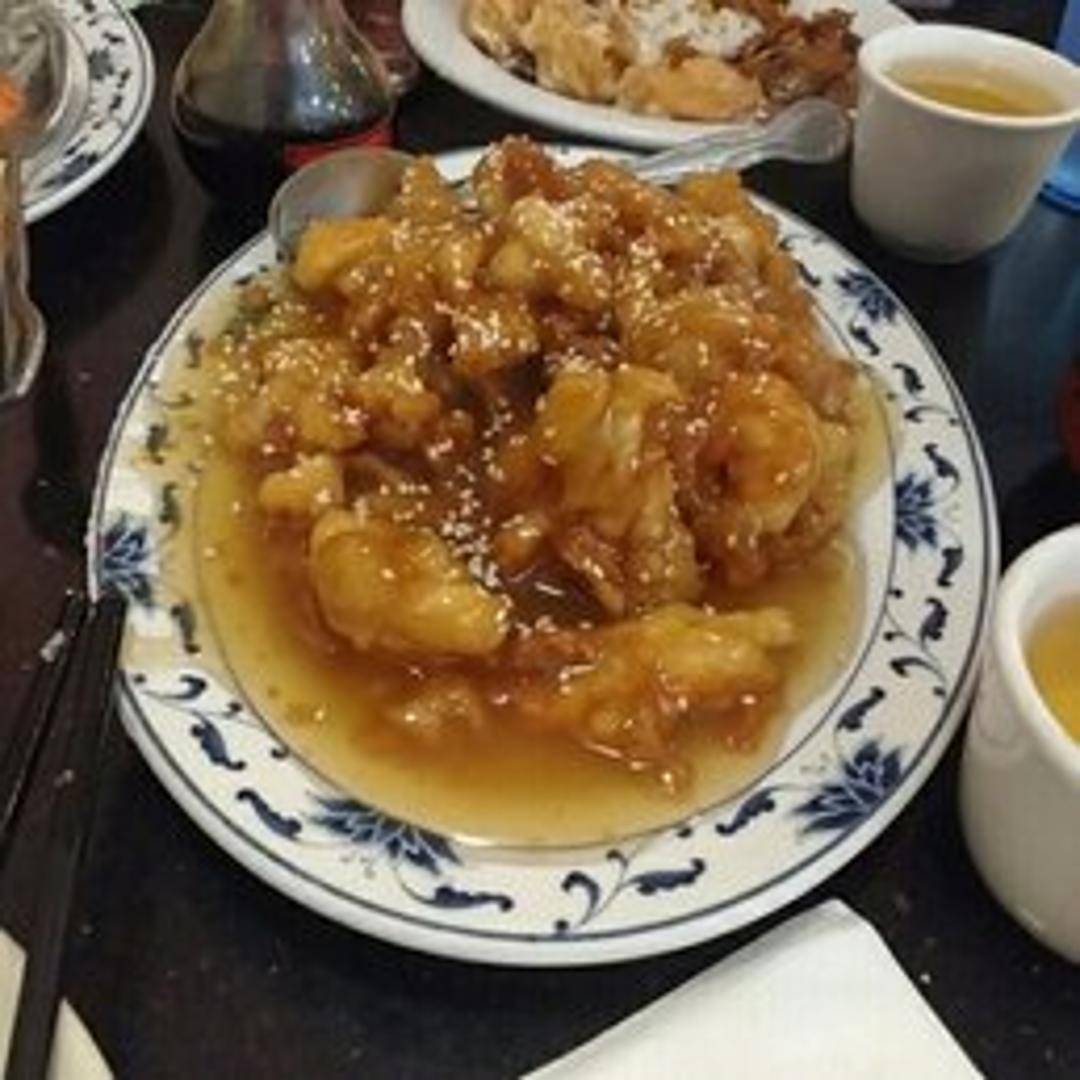 Crispy, bite-sized pieces of chicken coated in a sweet and savory sesame sauce. Served hot and often includes a garnish of sesame seeds.
