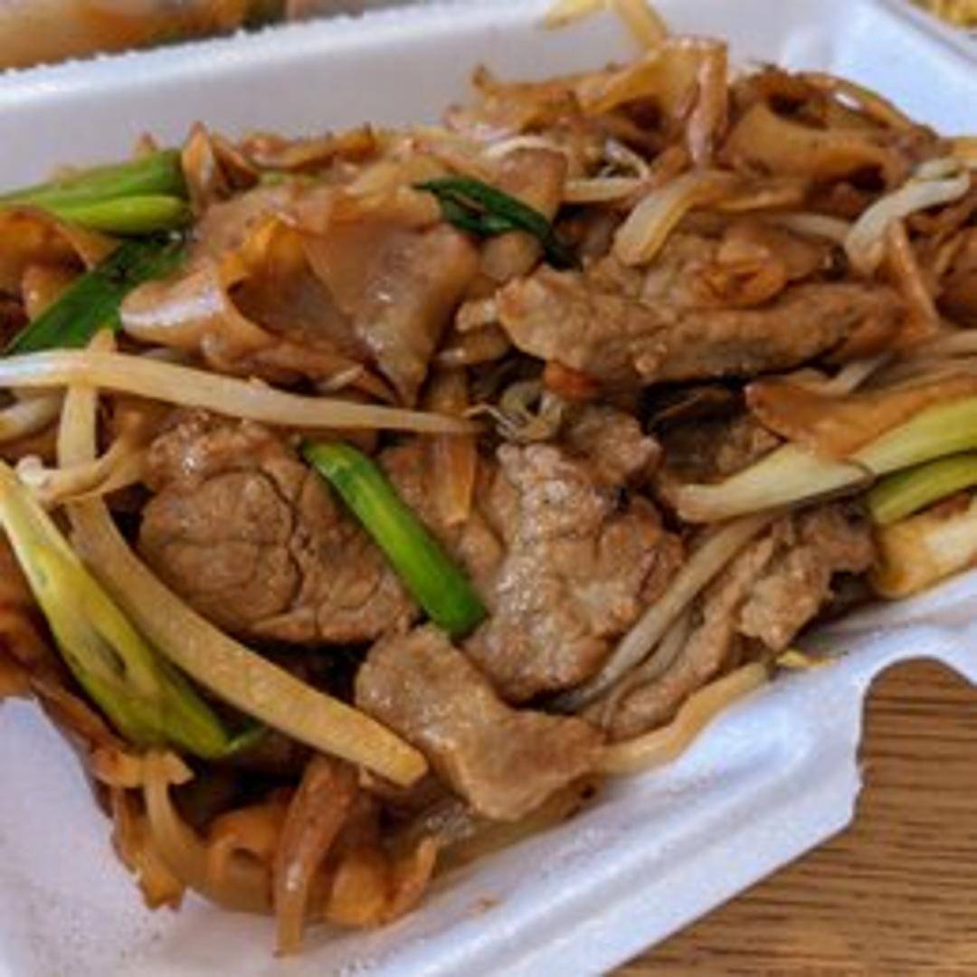 Wide rice noodles stir-fried with tender slices of beef, bean sprouts, scallions, and onions in a savory soy sauce-based sauce. The dish is known for its 'wok hei' or 'breath of the wok,' a slightly charred smoky flavor achieved through high-heat cooking.