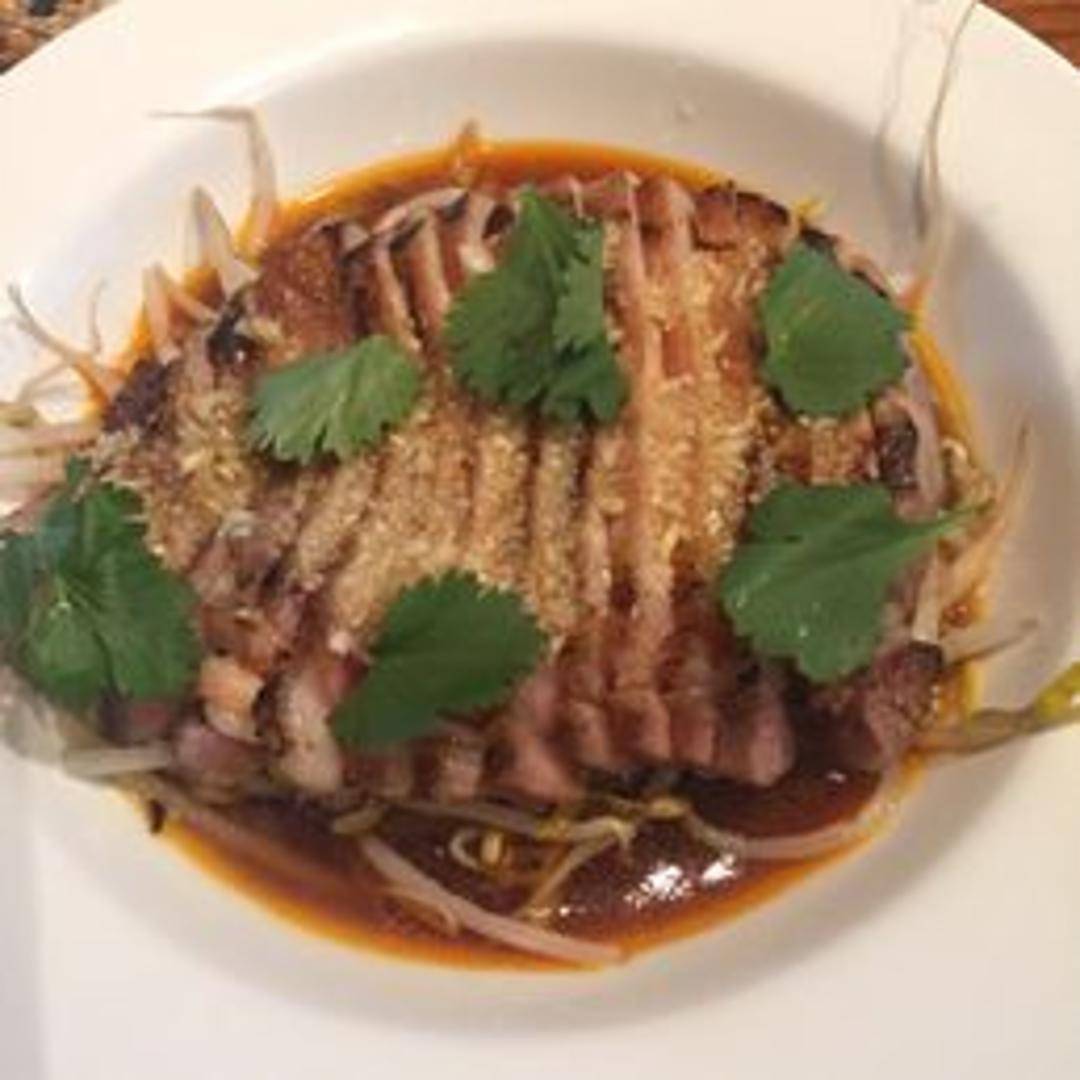 A marinated pork chop, grilled and finished with a fragrant garlic sauce.