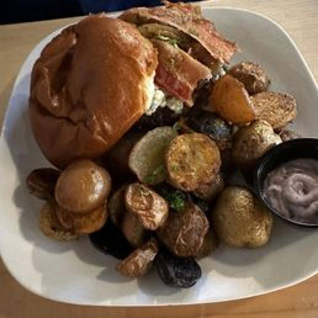 A juicy burger topped with crumbled bleu cheese, crispy bacon, lettuce, tomato, and our signature Juju sauce on a toasted bun.