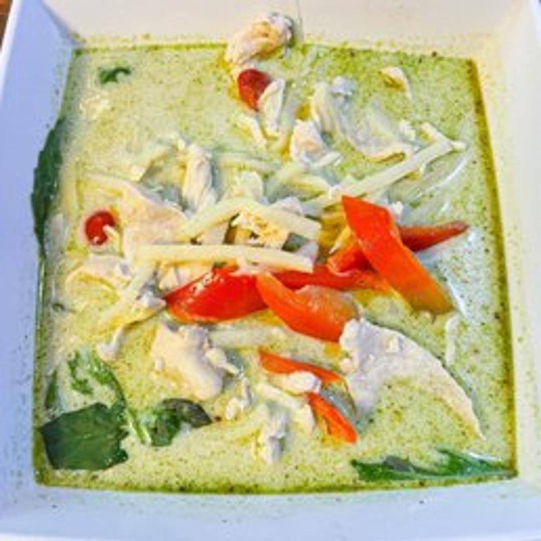 A fragrant and creamy curry made with green chilies, coconut milk, bamboo shoots, bell peppers, eggplant, and Thai basil. Choose your protein (chicken, pork, beef, tofu, or shrimp) for a delicious and aromatic experience served with steamed rice.