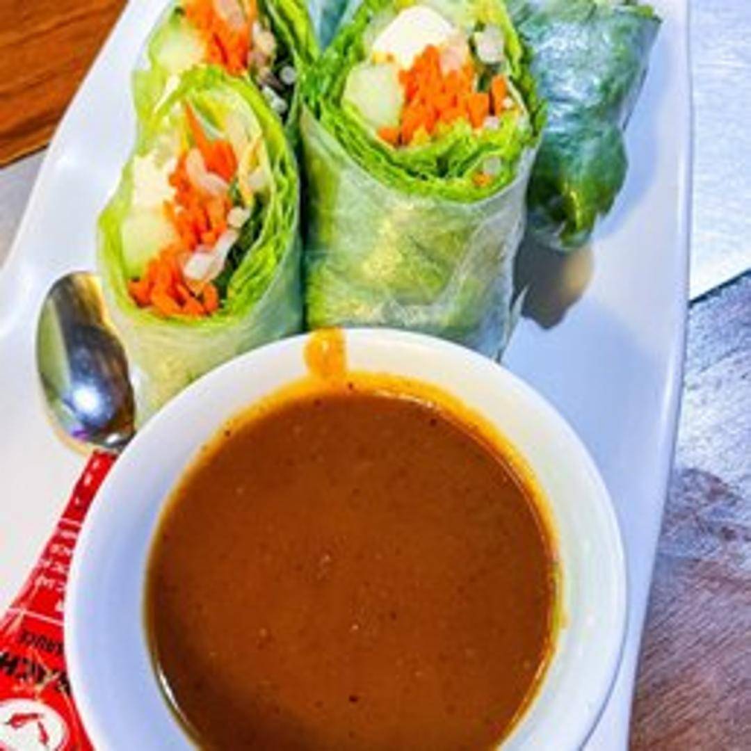 Fresh rice paper rolls filled with vermicelli noodles, shrimp, lettuce, carrots, and cilantro. Served with a peanut dipping sauce.