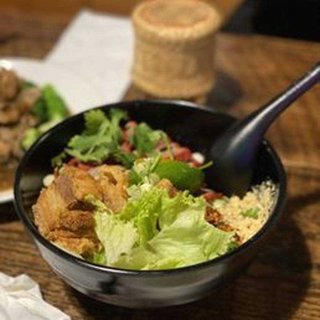 Green noodles stir-fried with vegetables and your choice of protein in a light sauce.