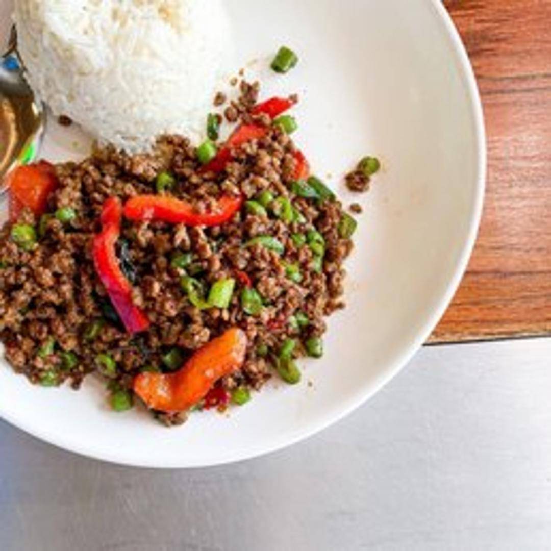 A stir-fried dish with your choice of protein (chicken, pork, beef, tofu, or shrimp) cooked with Thai basil, garlic, chilies, and a savory sauce. Served over rice and often topped with a fried egg for extra richness.