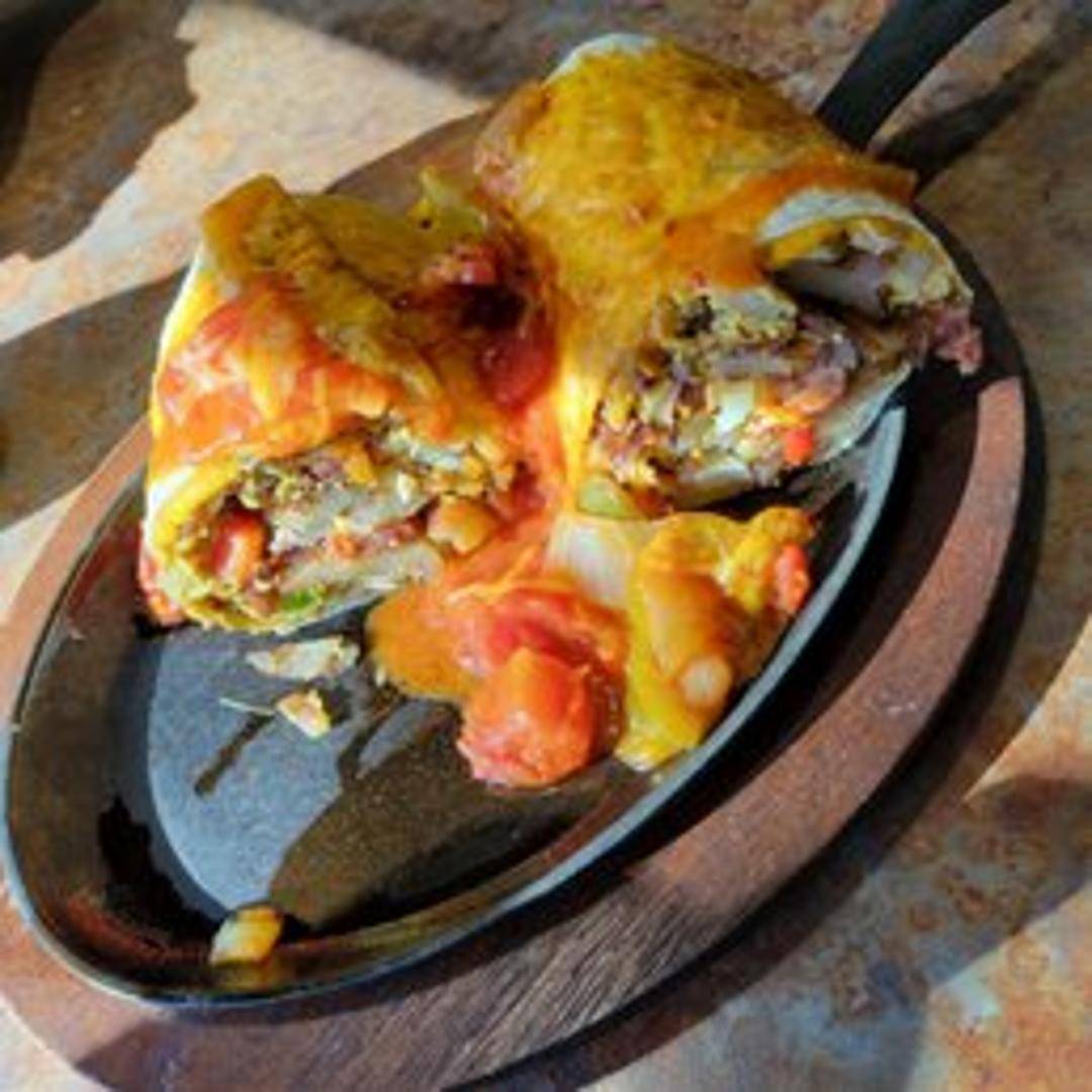 A large flour tortilla filled with scrambled eggs, your choice of meat (bacon, sausage, or chorizo), potatoes, cheese, and salsa.
