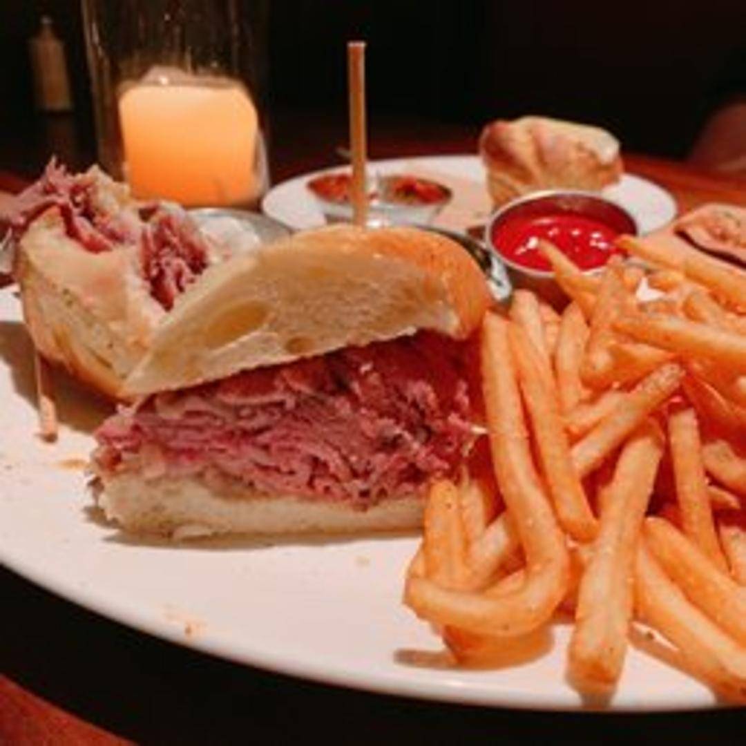 A quintessential American comfort classic, featuring generous layers of thinly sliced, tender slow-roasted beef piled high on a perfectly toasted artisan baguette, served with a rich, savory au jus for dipping, often accompanied by caramelized onions or melted provolone cheese.