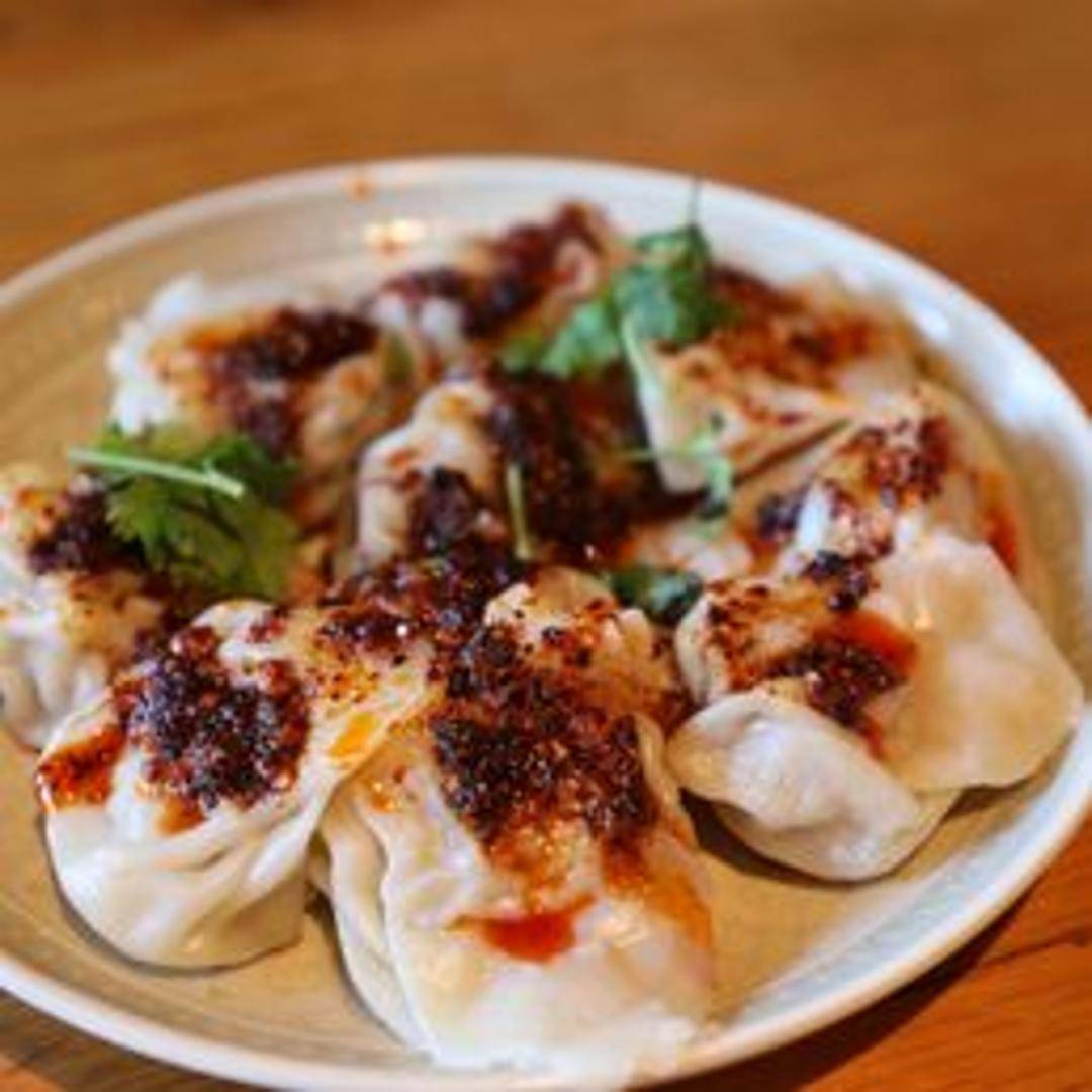 Savory pork wontons bathed in a vibrant and spicy chili oil sauce. These delicate dumplings are filled with a flavorful pork mixture and offer a satisfying combination of textures and tastes. Expect a balance of umami, heat, and a slight sweetness from the chili oil, all complemented by the soft, tender wonton wrappers. Garnished with sesame seeds and possibly scallions for added aroma and visual appeal.