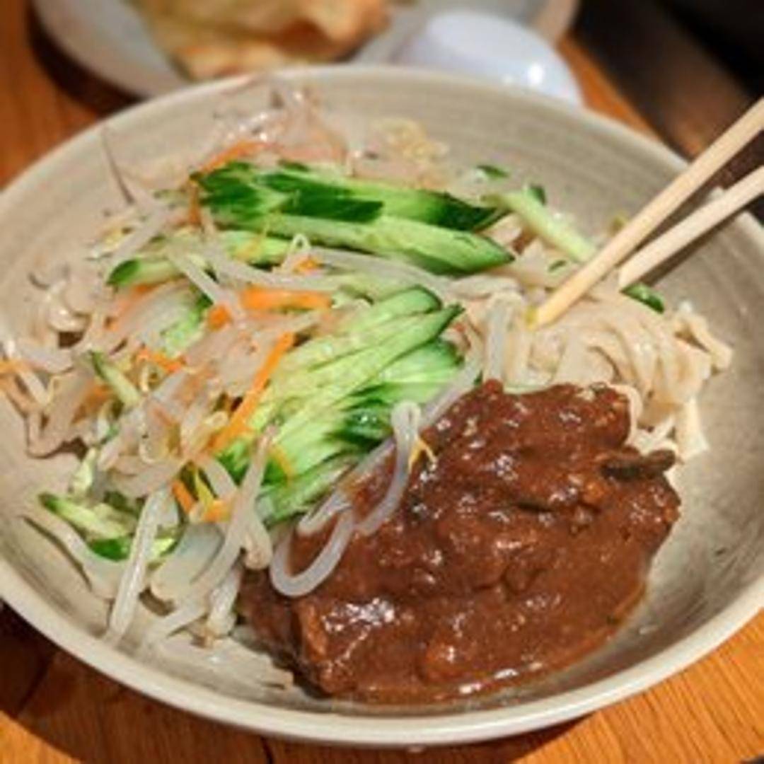 Thick noodles served with a rich and savory Zha Jiang sauce, made from fermented soybean paste. This hearty dish is topped with fresh cucumbers and bean sprouts.