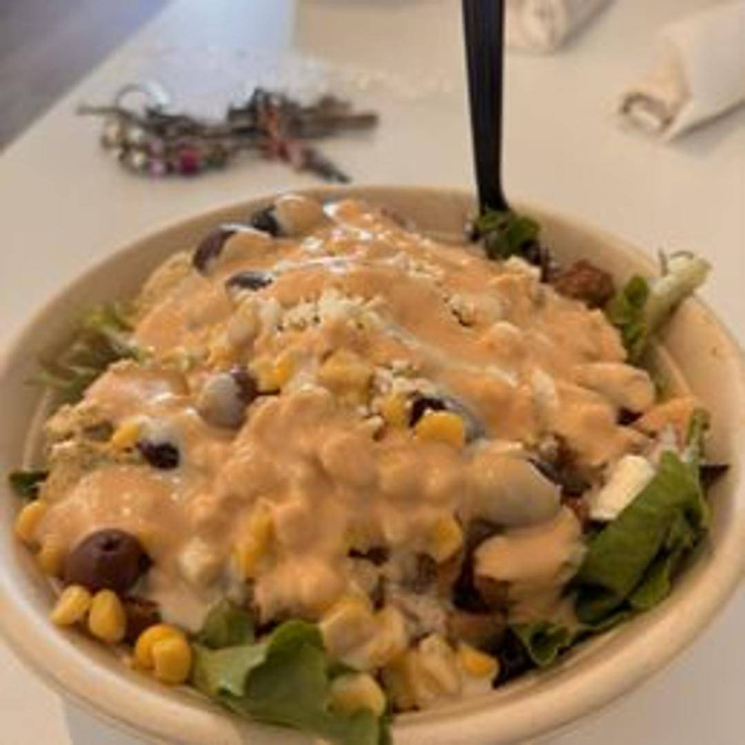 A generous serving of creamy, homemade hummus topped with your choice of protein (falafel, chicken, beef, etc.), Mediterranean salad (chopped tomatoes, cucumbers, onions, and parsley), tahini sauce, and a drizzle of olive oil. Served with pita bread on the side for dipping.