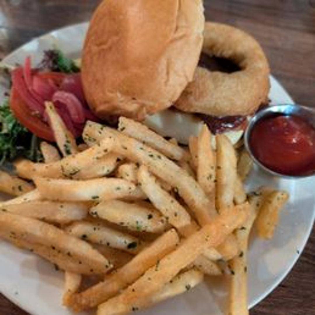A gourmet burger featuring a juicy patty topped with truffle-infused ingredients, such as truffle aioli, truffle cheese, or truffle shavings. A decadent and flavorful burger experience.