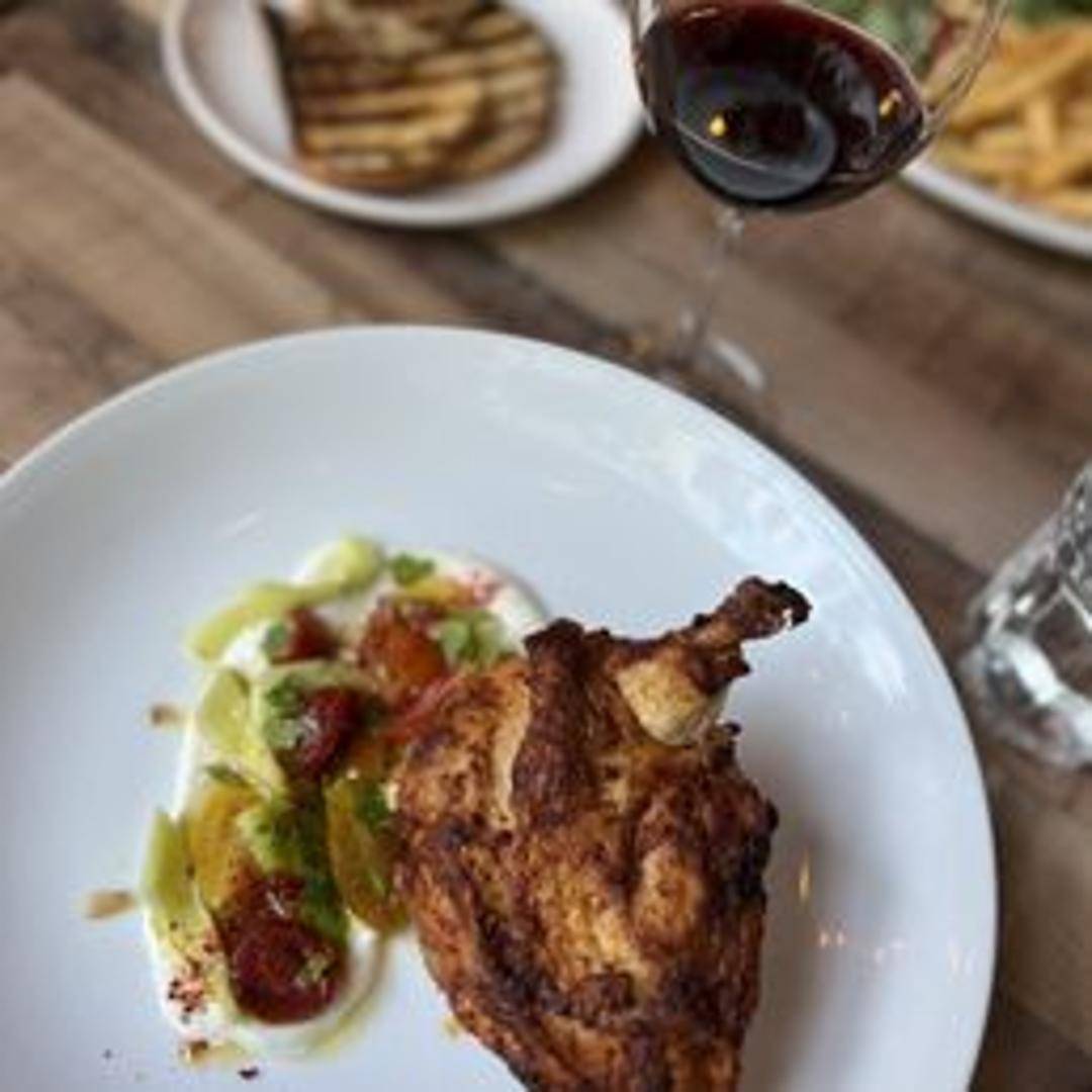 Half a chicken, seasoned and pan-seared under a brick for crispy skin and juicy meat. Served with seasonal vegetables and roasted potatoes.
