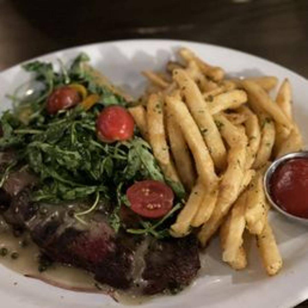A classic bistro dish featuring a perfectly cooked steak served alongside crispy, golden French fries. Often accompanied by a sauce, such as béarnaise or au poivre.
