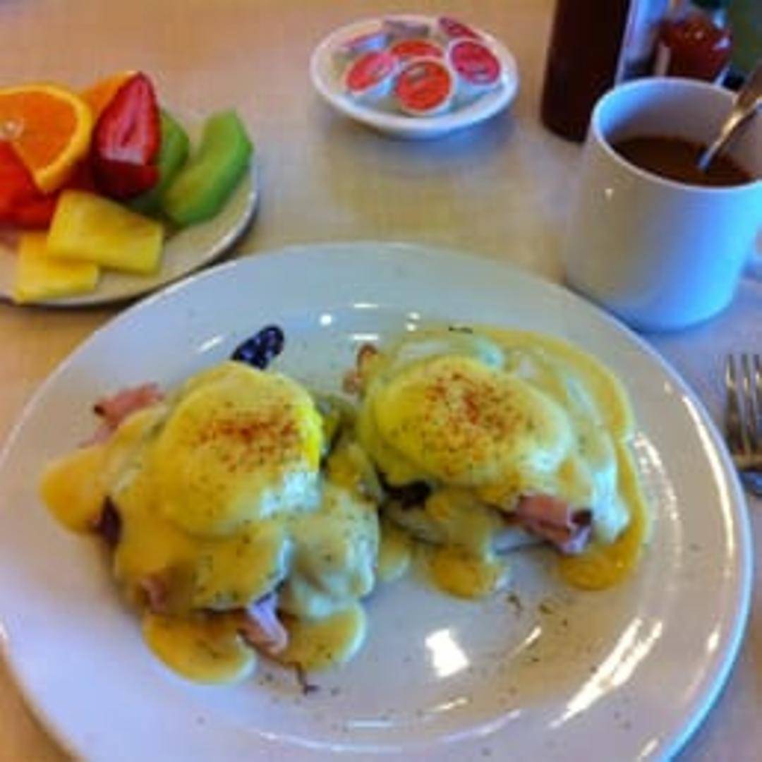 Two poached eggs atop toasted English muffins with Canadian bacon and hollandaise sauce. Served with a side of breakfast potatoes.