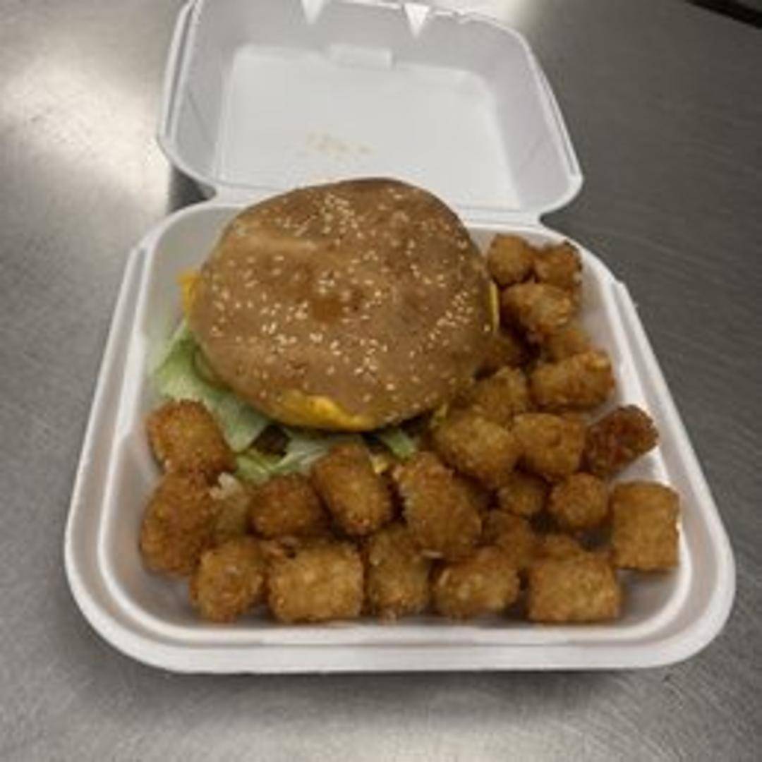 A classic cheeseburger featuring a grilled beef patty, melted cheese (typically American), crisp lettuce, ripe tomato slices, sliced onion, and tangy pickles, all served on a soft, toasted sesame seed bun. Condiments such as ketchup, mustard, and mayonnaise are available upon request.