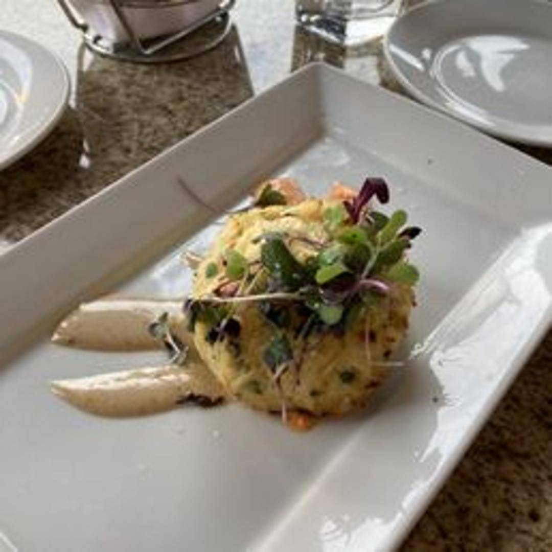 Indulge in our exquisite Crab Cake, generously crafted with jumbo lump crab meat, pan-seared to a golden perfection. This savory delight boasts minimal filler, allowing the sweet, delicate flavor of the crab to shine, perfectly complemented by a zesty house-made remoulade and a hint of fresh lemon.