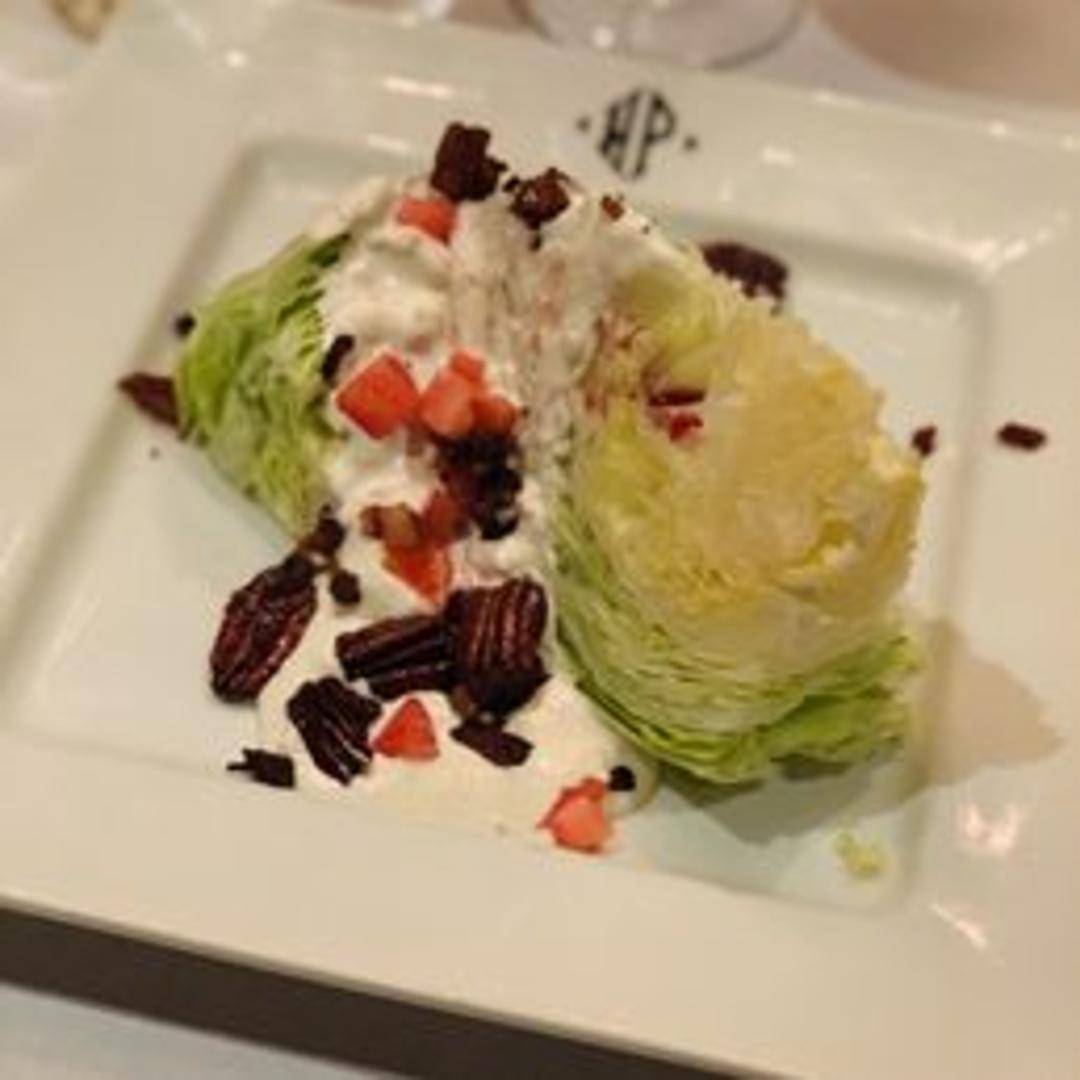 A classic steakhouse staple, our Wedge Salad features a crisp quarter of iceberg lettuce, generously drizzled with our rich and creamy blue cheese dressing. Crowned with crispy applewood-smoked bacon bits, diced heirloom tomatoes, and fresh chives, it's a refreshing and robust start to any meal.