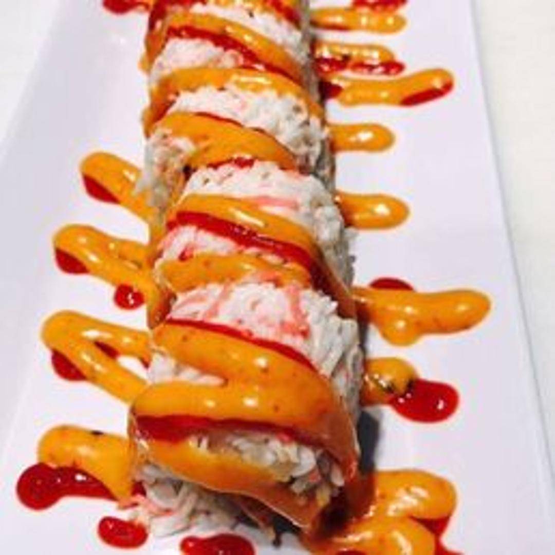 A baked roll with various seafood and vegetable. Topped with a special dynamite sauce and baked.