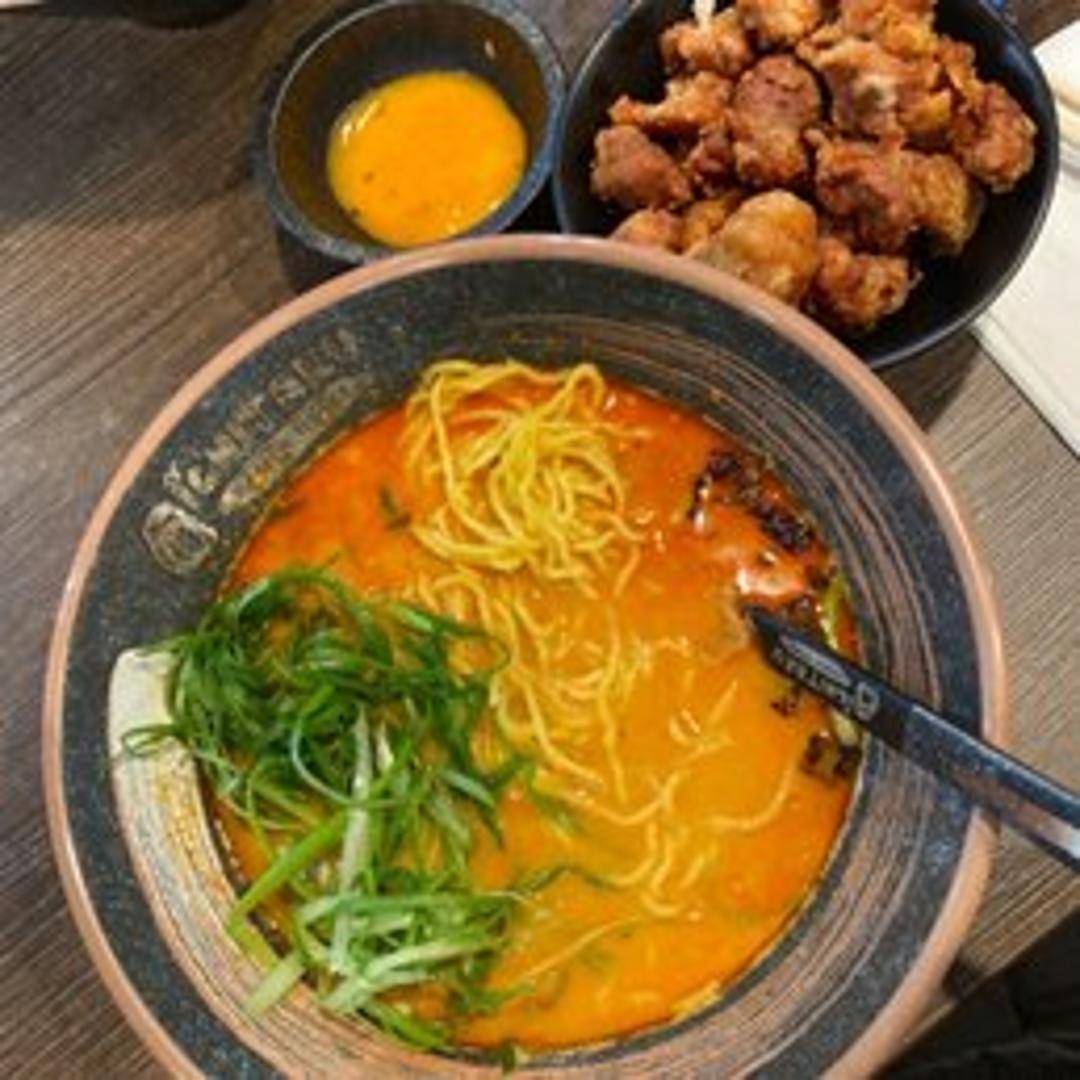 A savory ramen featuring crispy fried chicken as a topping. Served in a rich broth with noodles, vegetables, and other traditional ramen garnishes.